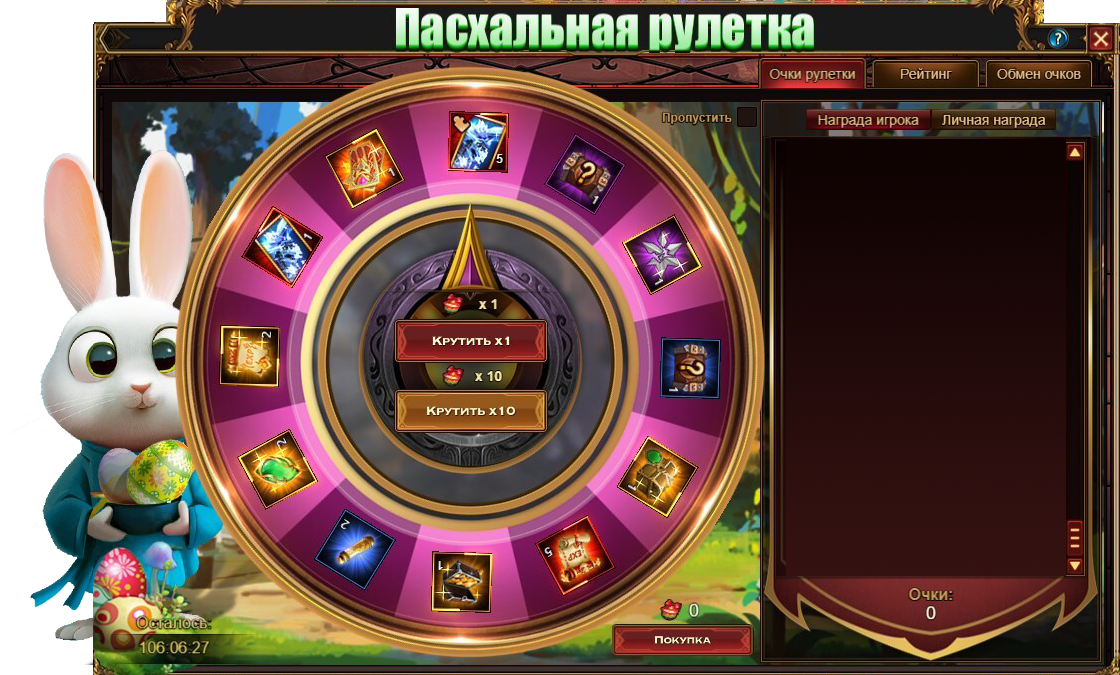 Полученные в рулетке очки можно использовать для получения целого спектра удивительных наград! Например, с их помощью вы можете приобрести тематические предметы: особый титул Повелитель Пасхи[Аватар] Милый Кролик и Пасхальную рамку. Также для обмена доступны непревзойденный Локи, фрагменты артефактов и полезные для любого искателя приключений ресурсы.