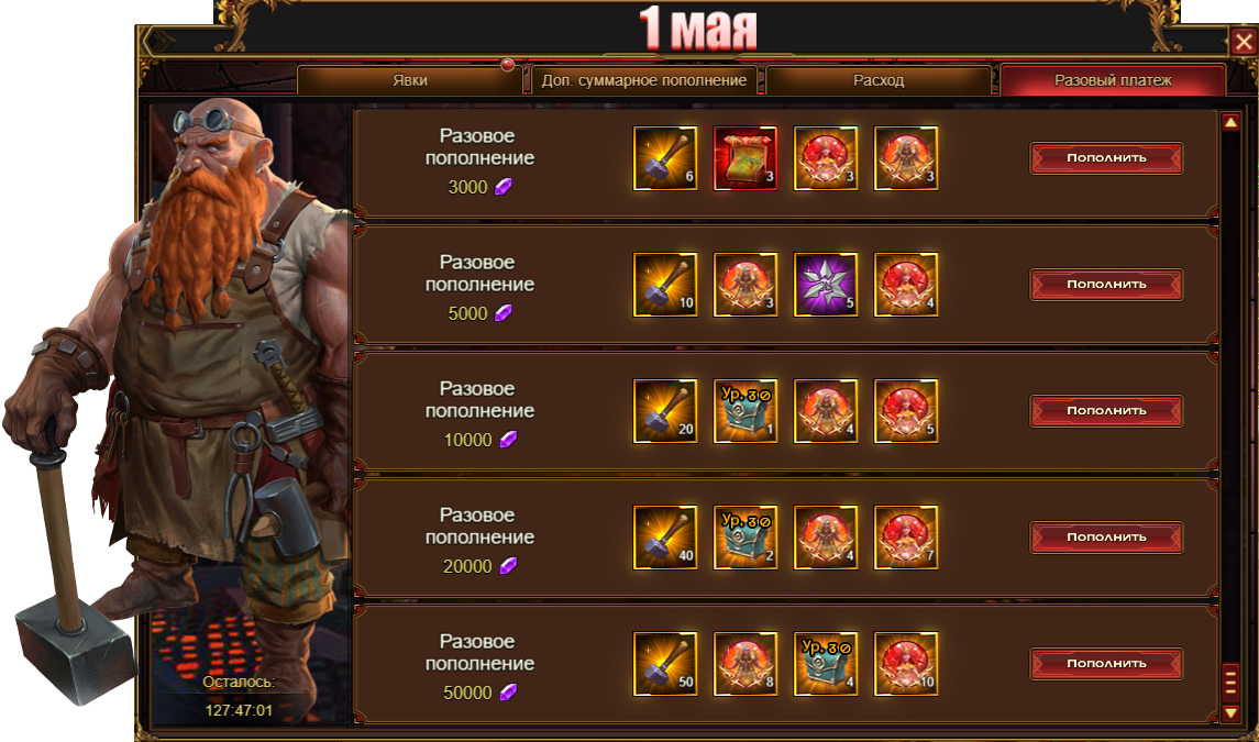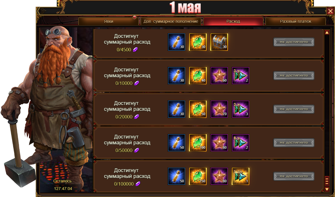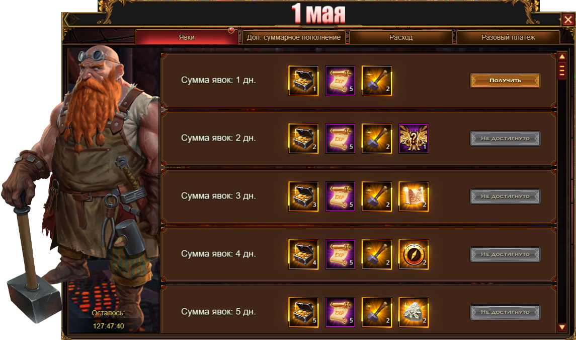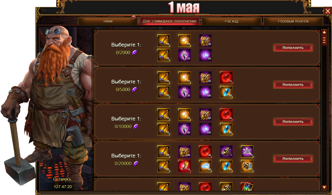 Пополните счет на определенные суммы за пять дней события и получите ЖетоныСундуки пробуждения богиниМрачные одеждыКристаллы элементаляКамни МудростиКристаллы шлифовкиЧастицы сердца, Сундуки книг навыков, Ловушки, Сундуки снаряжения скакуна (фиол.), Сундуки снаряжения скакуна (оранж.), Пески Темной звезды, Простые Горны, [Карта] Ветвь Мирового Древа, Богиню Льда, Отличную Фею (питомец) и [Карта] Фригг