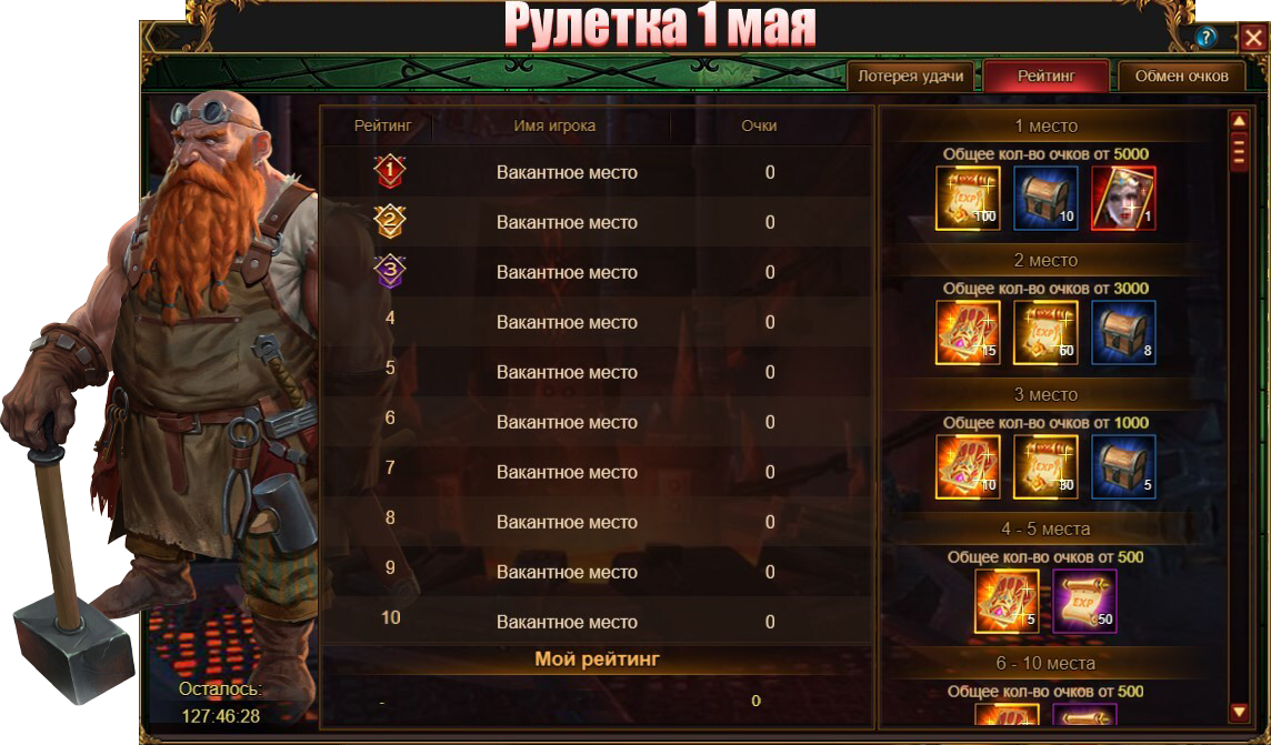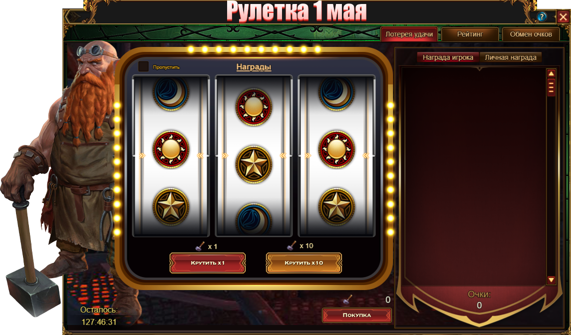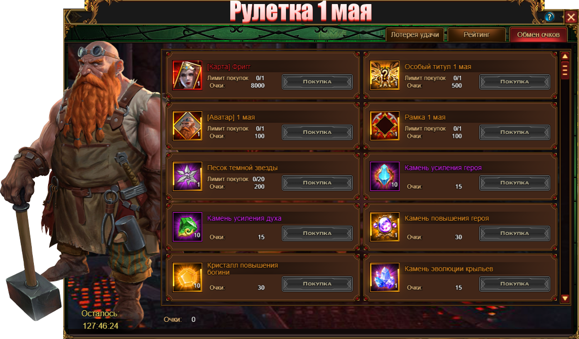Полученные в рулетке очки можно использовать для получения целого спектра удивительных наград! Например, с их помощью вы можете приобрести тематические предметы: особый Титул 1 Мая[Аватар] 1 мая и Рамка 1 мая. Также для обмена доступны очаровательная Фригг, фрагменты артефактов и полезные для любого искателя приключений ресурсы.