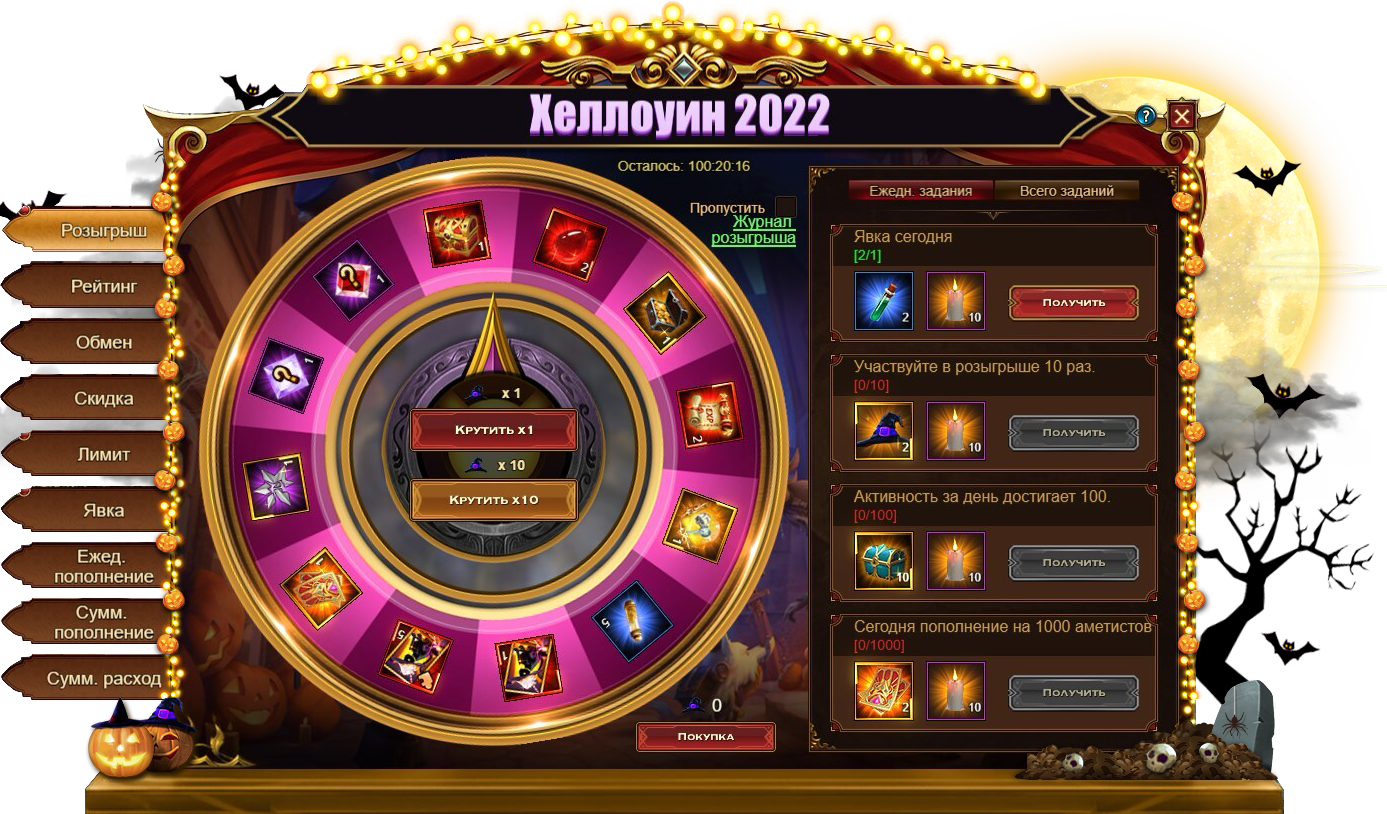 наборов наград со следующими предметами: Сундук пробуждения богини, Сундук души 1, Эссенция пробуждения, Частица сердца, Ведьмина шляпа, Свеча, Фрагмент крыльев ужаса, Камень мудрости, Цитрин, Кристалл шлифовки, Карта героя класса SSR, Кристалл души крыльев, Сундук рун героя, Книга мертвых, тематические Наряд Хеллоуина и Серп Хеллоуина, Богиню ветра, Отличную марионетку, [Эпич.] Стигмат и даже [Карта] Хеймдалль!