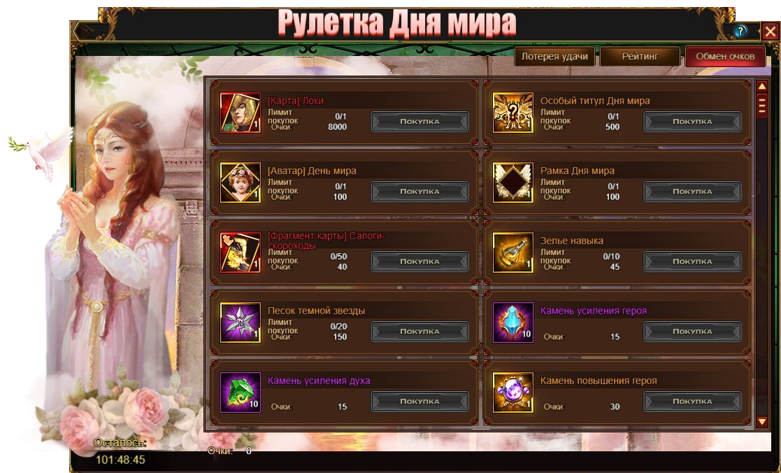 Полученные в рулетке очки можно использовать для получения целого спектра удивительных наград! Например, с их помощью вы можете приобрести тематические предметы: особый Титул Дня Мира[Аватар] День Мира и Рамка Дня Мира. Также для обмена доступны коварнейший Локи, Зелья навыков и другие полезны для любого искателя приключений ресурсы.