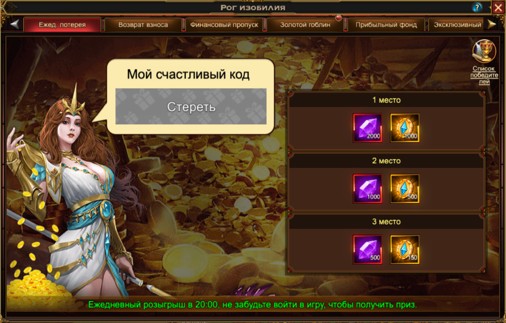 • Рог изобилия — сразу семь новых функционалов в одном — Ежедневная лотерея, Возврат взноса, Финансовый пропуск, Золотой гоблин, Прибыльный фонд, Эксклюзивный фонд и Магазин изобилия. Огромный простор для развития вашего персонажа!