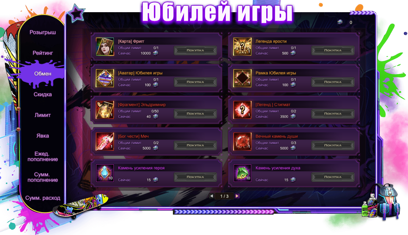 На данной вкладке расположены предметы, которые можно приобрести за внутриигровую валюту, в том числе и со скидкой. В этот раз для покупки доступны: VR шлем, Легендарный эльф, Фиолетовое созвездие, [Питомец] Доспех вечности, Сундук рун героя, Осколок метеорита, Хорошая марионетка.