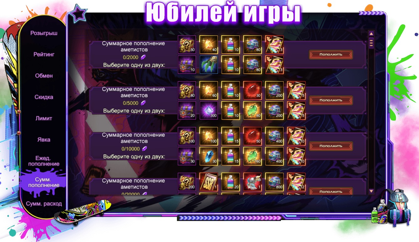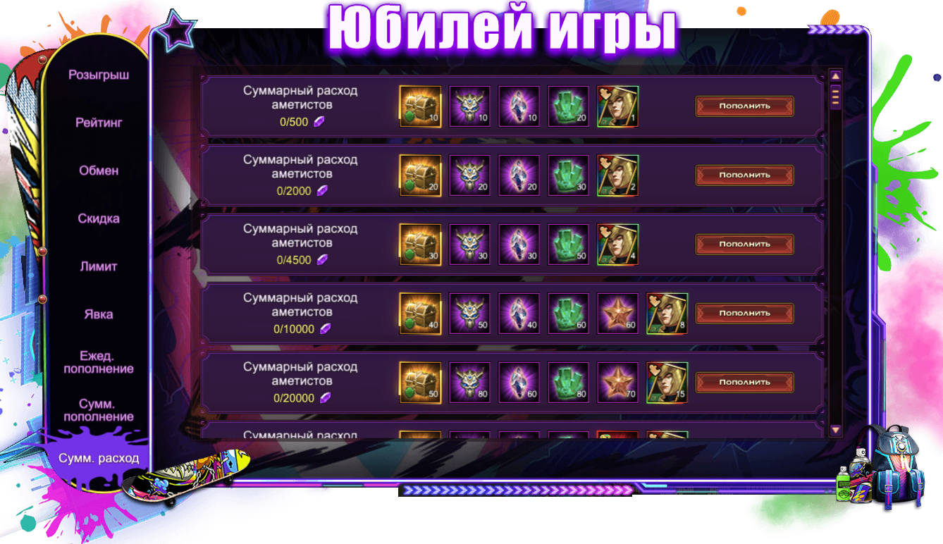 За пополнение счета на определенное количество аметистов за один день, вы можете получить: Сундук карт SR, Баллончик с краской, VR шлем, Сфера священного наряда, Обучающее устройство, Сундук карт SSR, Сундук самоцветов 8 ур., Песок темной звезды, Кодекс крыльев святости, Оранжевое созвездие, Сундук редкостей, Фрагмент карнавальных крыльев, Сундук с кодексом, Сундук реликвий, Письмо с молитвой, Сундук карт UR, [Фрагмент карты] Тюр.