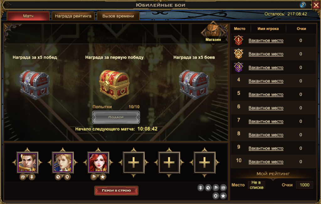 Юбилейные бои - матч, награда рейтинга, вызов времени