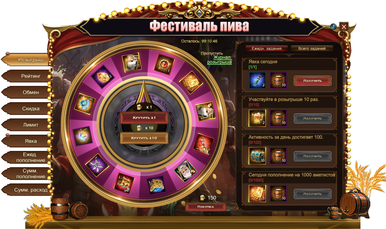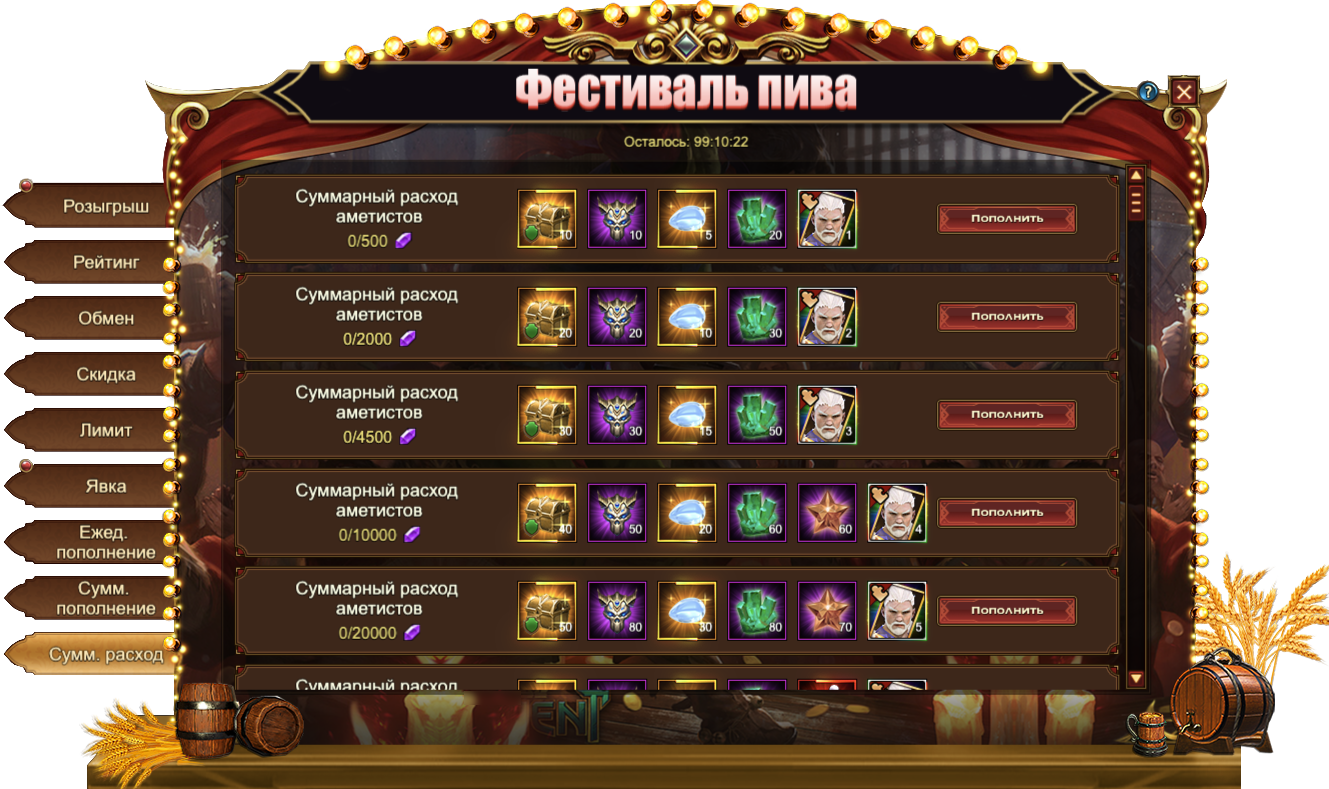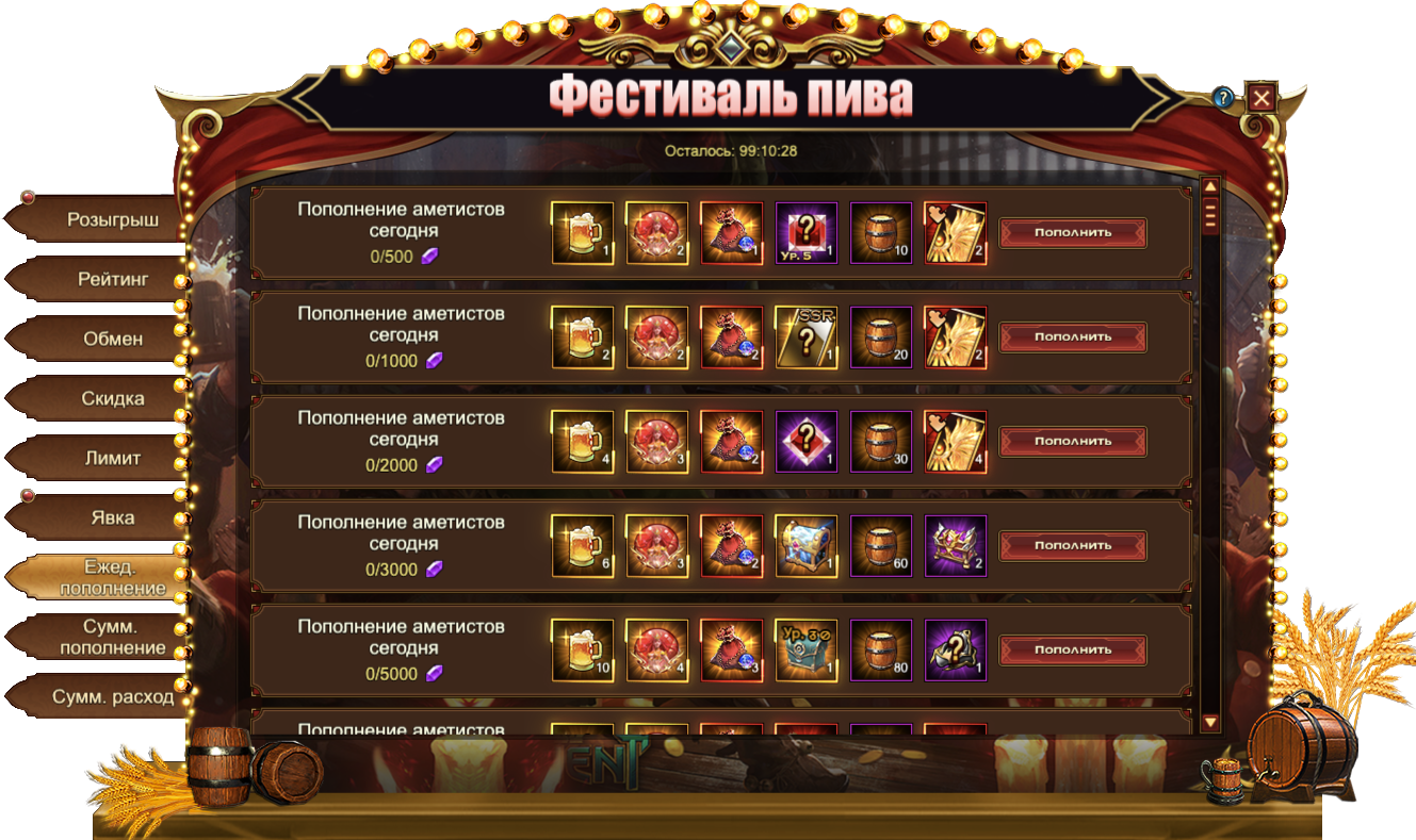 За пополнение счета на определенное количество аметистов за один день, вы можете получить: Сундук самоцветов 5 ур., Сундук самоцветов 6 ур., Сундук камней элементаля 4 ур., Сундук снаряжения скакуна (фиол.)Бочка пиваПивоДуша богиниОранжевое созвездиеСундук самоцветов 7 ур., Кодекс крыльев святостиСундук снаряжения героя (оранж.)Сущность артефактаСундук редкостейСундук с кодексом, [Фрагмент] Крыльев возрождения[Фрагмент] Ярнгрейпр, Красное созвездие[Фрагмент карты] Тюр.