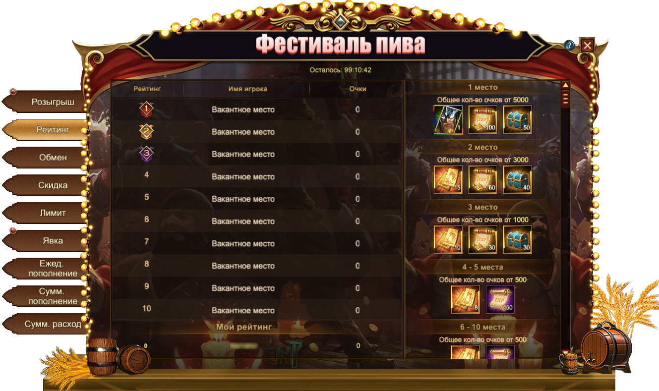 За участие в Розыгрыше вы получаете специальные очки, определяющие ваше положение в Рейтинге фестиваля. В зависимости от положения в рейтинге можно получить: Свитки славыОранжевые свитки опытаОсобые сундуки материаловФиолетовые свитки опыта и даже героя класса UR - яростного Тора