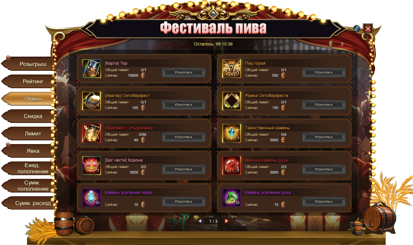 Голуби мира, собранные во время данного Фестиваля, позволяют приобрести множество интересных предметов, в том числе и эксклюзивных для данного события: [Карта] Тор, Особый титул Пир горой[Аватар] ОктоберфестРамка Октоберфеста[Фрагмент] Эльдримнир. Если эксклюзивные предметы вас не интересуют, всегда можно обменять Бочки пива на полезные ресурсы. Например, на Вечный камень душиТаинственный камень или [Бог чести] Корона