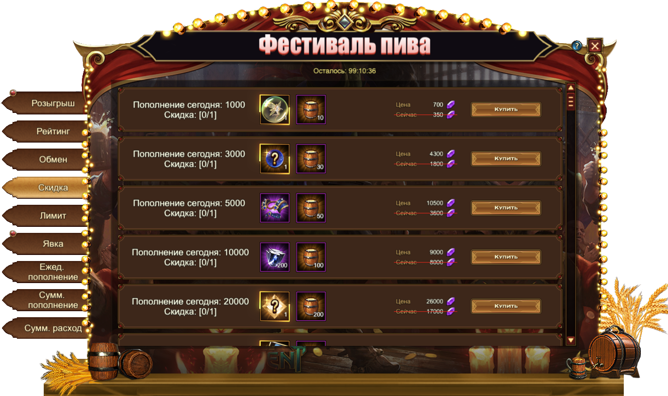 Обратите внимание, для активации скидки необходимо выполнить условие из первого столбца. Например, на скриншоте ниже, для приобретения со скидкой набора из Легендарного Эльфа и 10 Бочек пива мира необходимо пополнить счет на 1000.