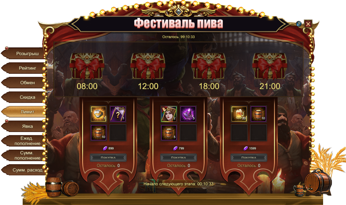 Здесь любопытные искатели приключений могут отыскать временные предложения, доступные в течение ограниченного времени и в ограниченном количестве. Группы товаров доступы с 8:00 до 11:59, с 12:00 до 17:59, с 18:00 до 20:59 и с 21:00 до 7:59. В этот раз вы можете получить в том числе: Бочка пиваПивоОбучающее устройство, Сундук карт SR, Чароит[Фрагмент Карты] Фригг.