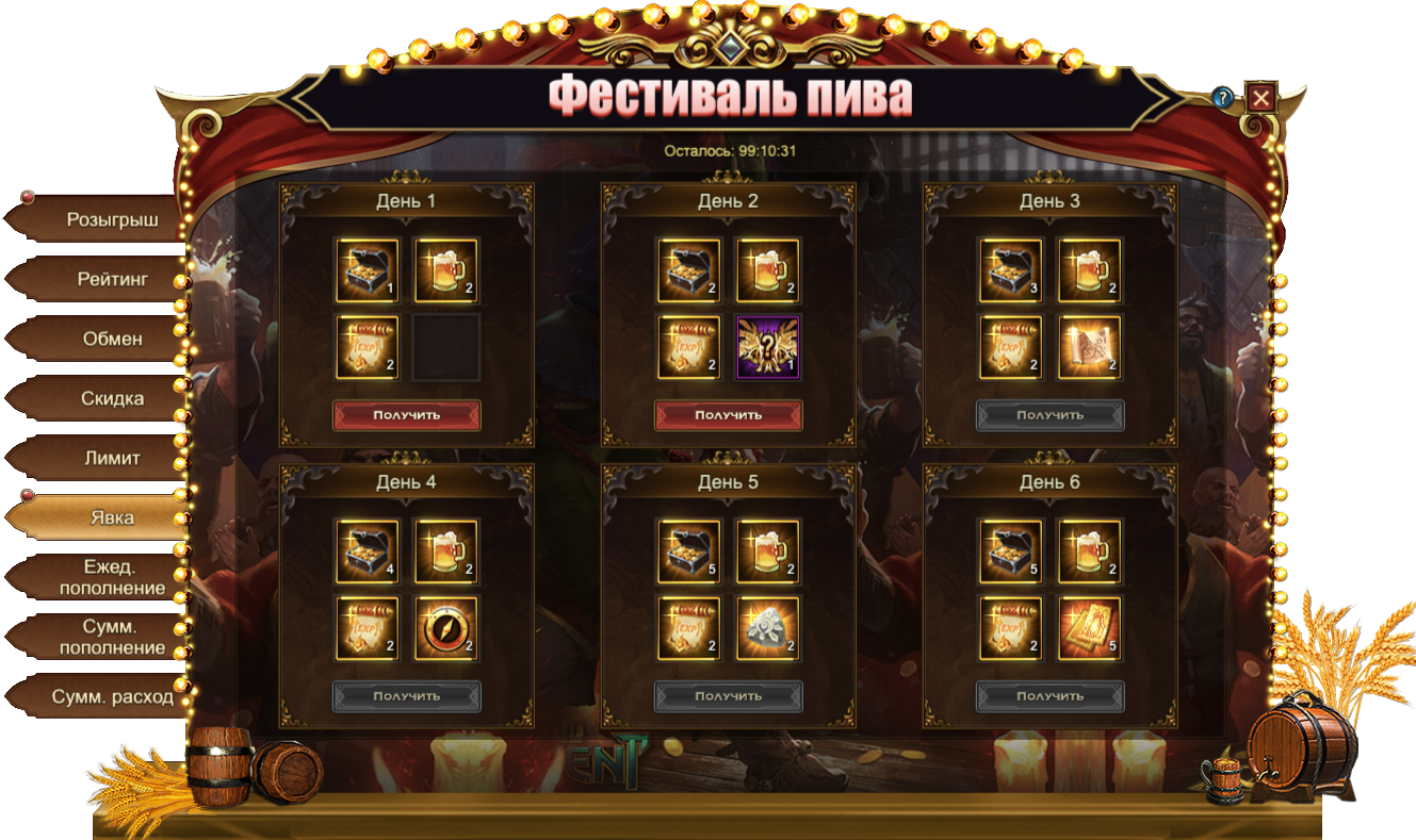 За посещение события ежедневно становятся доступны различные подарки. Например: Пиво, Сумка золотаОранжевый свиток опыта, уникальный титул КутилаПотерянная картаПропуск на Арену и Свиток славы.