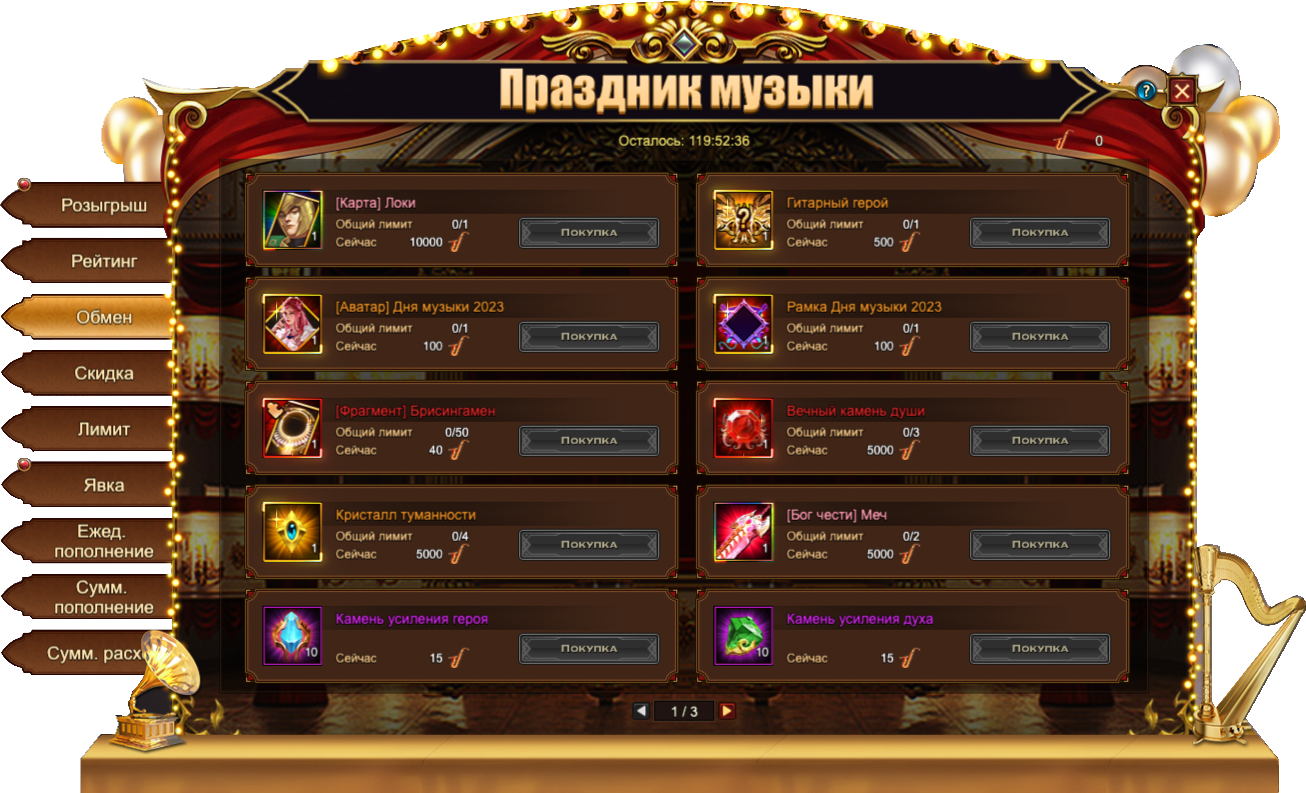Саксофоны, собранные во время данного Фестиваля, позволяют приобрести множество интересных предметов, в том числе и эксклюзивных для данного события: [Карта] ЛокиОсобый титул Гитарный герой[Аватар] День музыки 2023Рамка Дня музыки 2023[Фрагмент] Брисингамен. Если эксклюзивные предметы вас не интересуют, всегда можно обменять Бочки пива на полезные ресурсы. Например, на Вечный камень душиКристалл туманности или [Бог чести] Меч