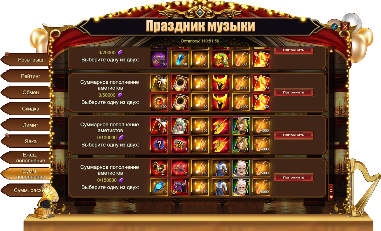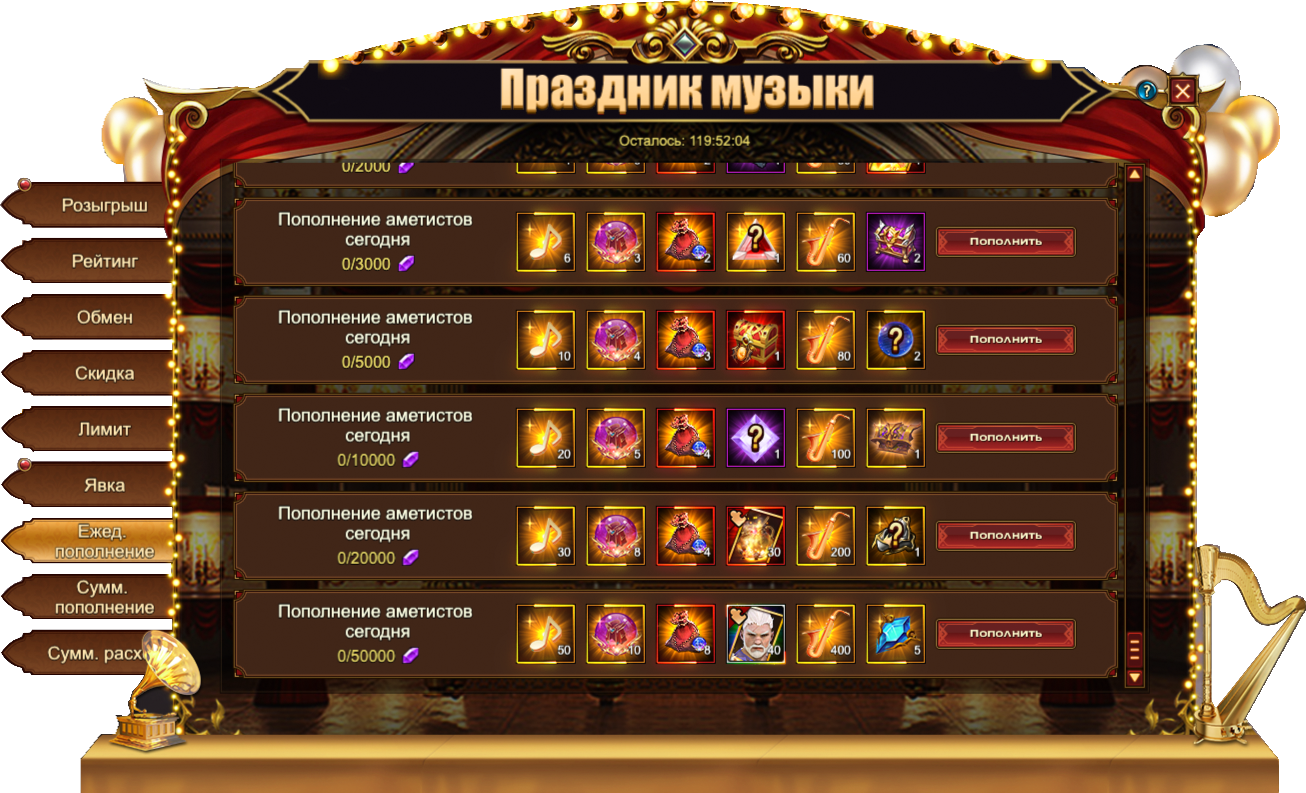 За пополнение счета на определенное количество аметистов за один день, вы можете получить: Сундук самоцветов 5 ур.Сундук самоцветов 6 ур.Сундук камней элементаля 4 ур.Сундук карт SR, [Героич.] СтигматНота, СаксофонДуша обликаОранжевое созвездиеСундук кристаллов 7 ур.Сундук снаряжения скакуна (оранж.)Сундук снаряжения героя (оранж.)Сущность артефактаСундук редкостей, Сундук с кодексомФрагмент фламинго[Фрагмент] Эльдримнир, [Фрагмент карты] Тюр.