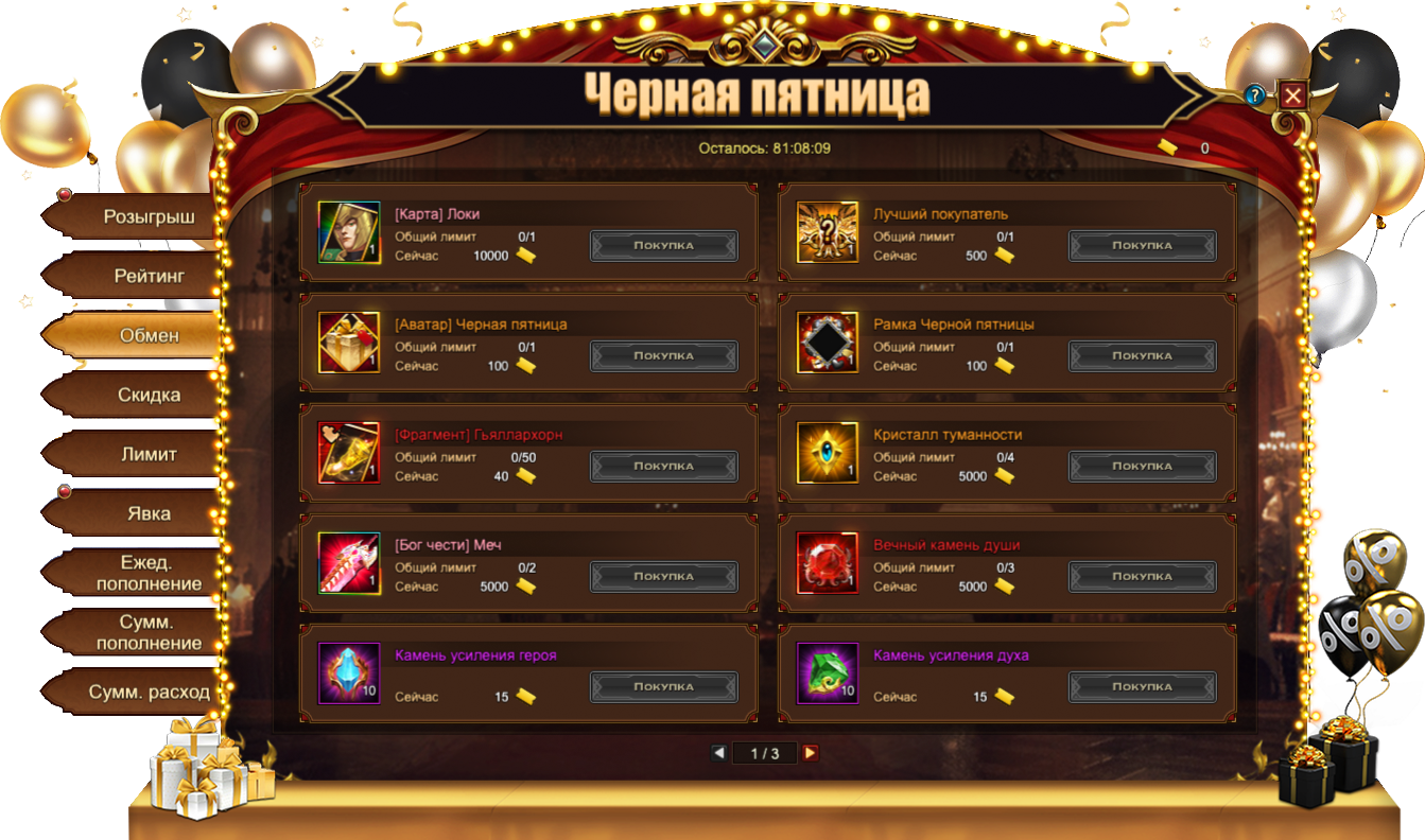 Купоны, собранные во время данного Фестиваля, позволяют приобрести множество интересных предметов, в том числе и эксклюзивных для данного события: [Карта] Локи, Особый титул Лучший покупатель[Аватар] Черная пятницаРамка Черной пятницы[Фрагмент] Гьяллархорн. Если эксклюзивные предметы вас не интересуют, всегда можно обменять купоны на полезные ресурсы. Например, на Вечный камень душиКристалл туманности или [Бог чести] Меч