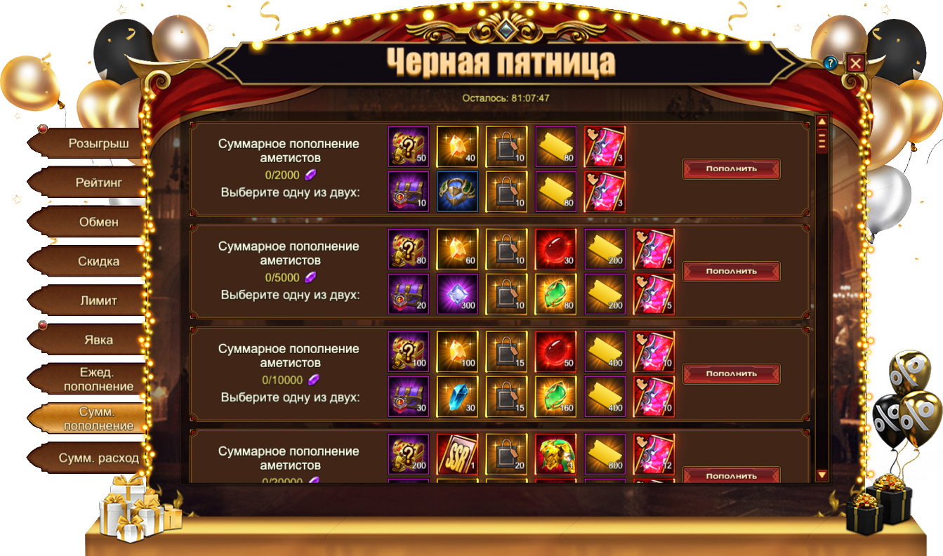 За пополнение счета на определенное количество аметистов за один день, вы можете получить: Сундук самоцветов 6 ур.Сундук магических камней 3 ур.Сундук камней элементаля 4 ур.Фиолетовое созвездие, Купон, ПакетДуша обликаОранжевое созвездиеСундук кристаллов 7 ур.Сундук снаряжения героя (оранж.)Сундук книг навыков (оранж.)[Эпич.] СтигматСущность артефактаСундук редкостейСундук с кодексомФрагмент кровавого глаза, Сундук карт UR[Фрагмент карты] Тюр.