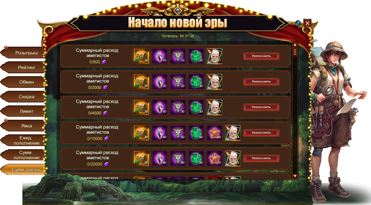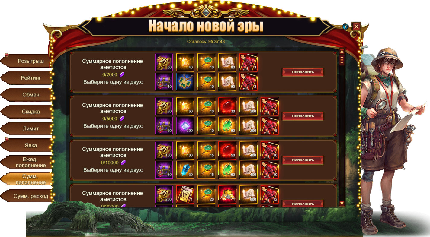 За пополнение счета на определенное количество аметистов за один день, вы можете получить: Сундук кристаллов 6 ур., Сундук камней элементаля 4 ур.Лунный камень души, Лупа авантюристаКарта авантюристаДуша облика, Песок темной звезды, Сундук карт SSR, Оранжевое созвездиеСундук самоцветов 7 ур.Сундук снаряжения героя (оранж.)Сундук книг навыков (оранж.)Сундук снаряжения скакуна (оранж.)Сущность артефактаСундук редкостейСундук с кодексомФрагмент Цербера[Фрагмент карты] Тюр.