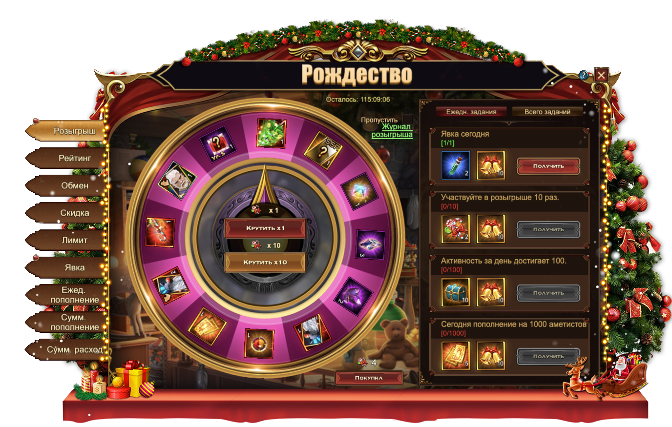 Участвуйте в розыгрыше различных ценных предметов, чтобы получить: Чароит, Мрачные одежды, Осколок метеорита, Сундук кристаллов 5 ур., Свиток славы, Сундук карт SSR, Кристалл души крыльев, Фрагмент рождественских саней, Оружие снеговика, [Фрагмент карты] Тюр и даже восхитительные Рождественские сани целиком!