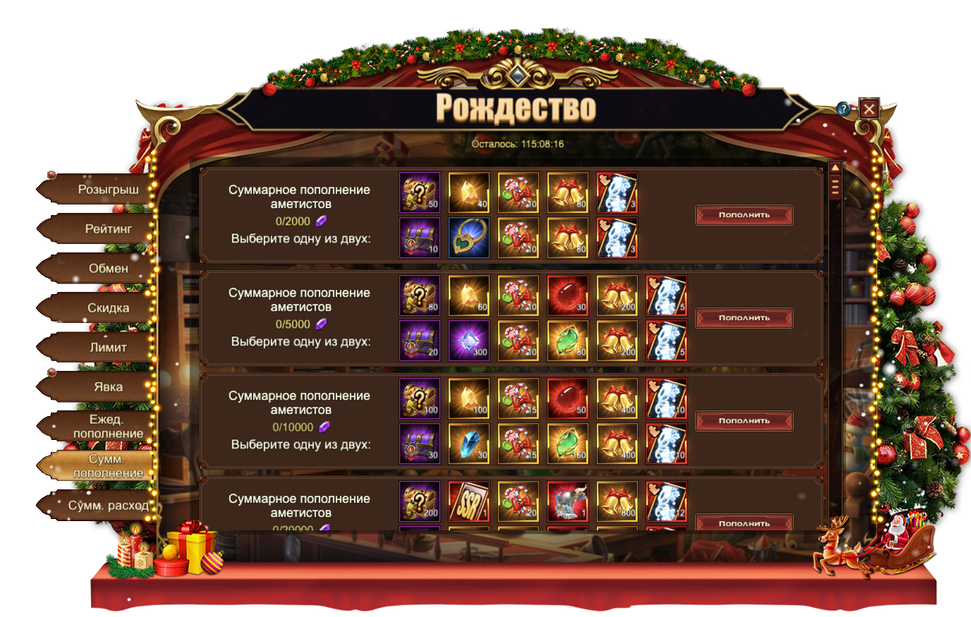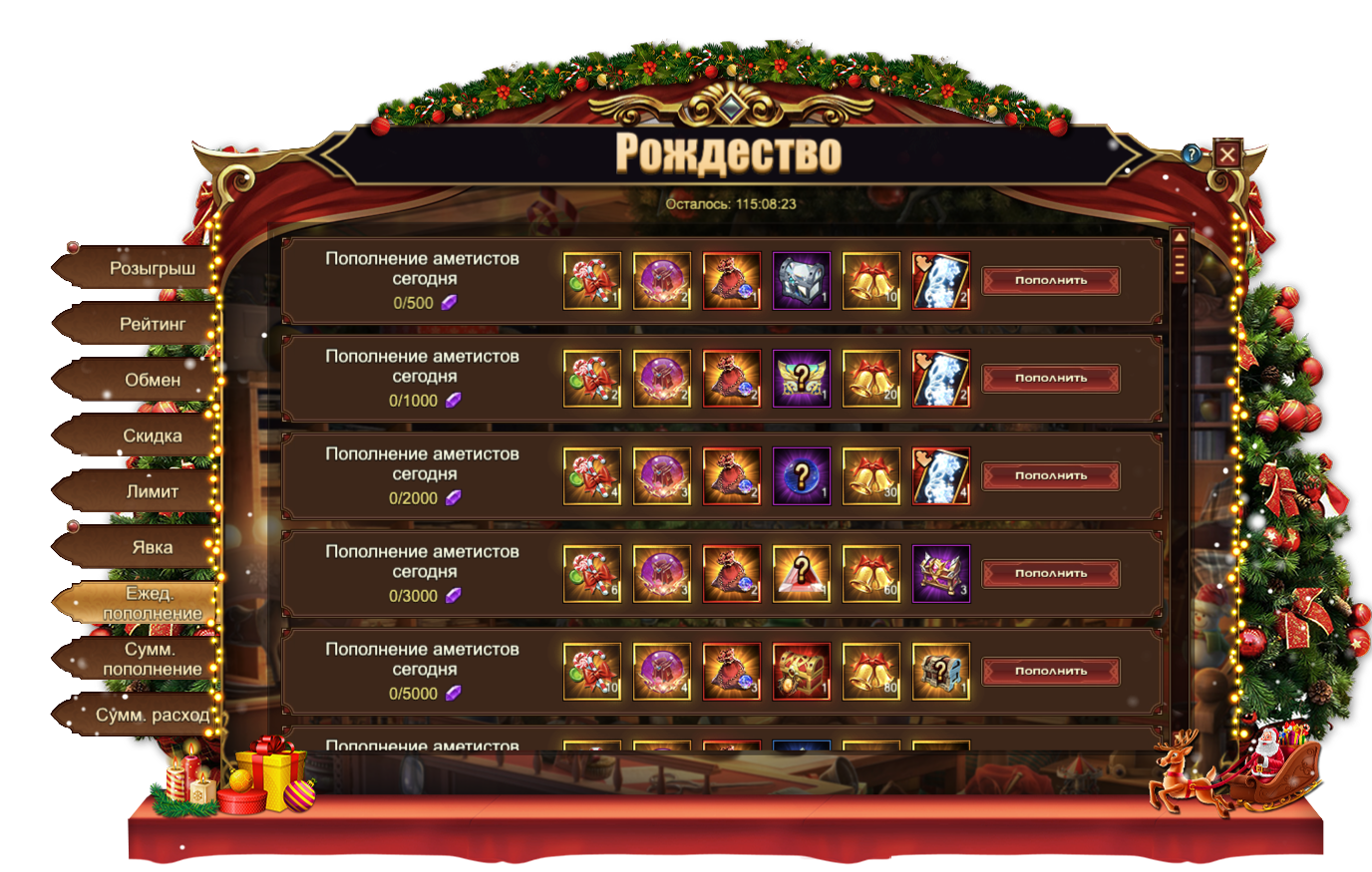 За пополнение счета на определенное количество аметистов за один день, вы можете получить: Астральный камень души, Сундук самоцветов 6 ур., Сундук камней элементаля 4 ур., Сундук магических ядер 3 ур., Фиолетовое созвездие, [Эпич.] Стигмат, Колокольчики, Рождественские конфеты, Душа облика, Сундук книг навыков, Оранжевое созвездие, Сундук кристаллов 7 ур., Сундук снаряжения героя (оранж.), Сущность артефакта, Сундук редкостей, Сундук с кодексом, Фрагмент ледяных крыльев, [Фрагмент карты] Тюр.