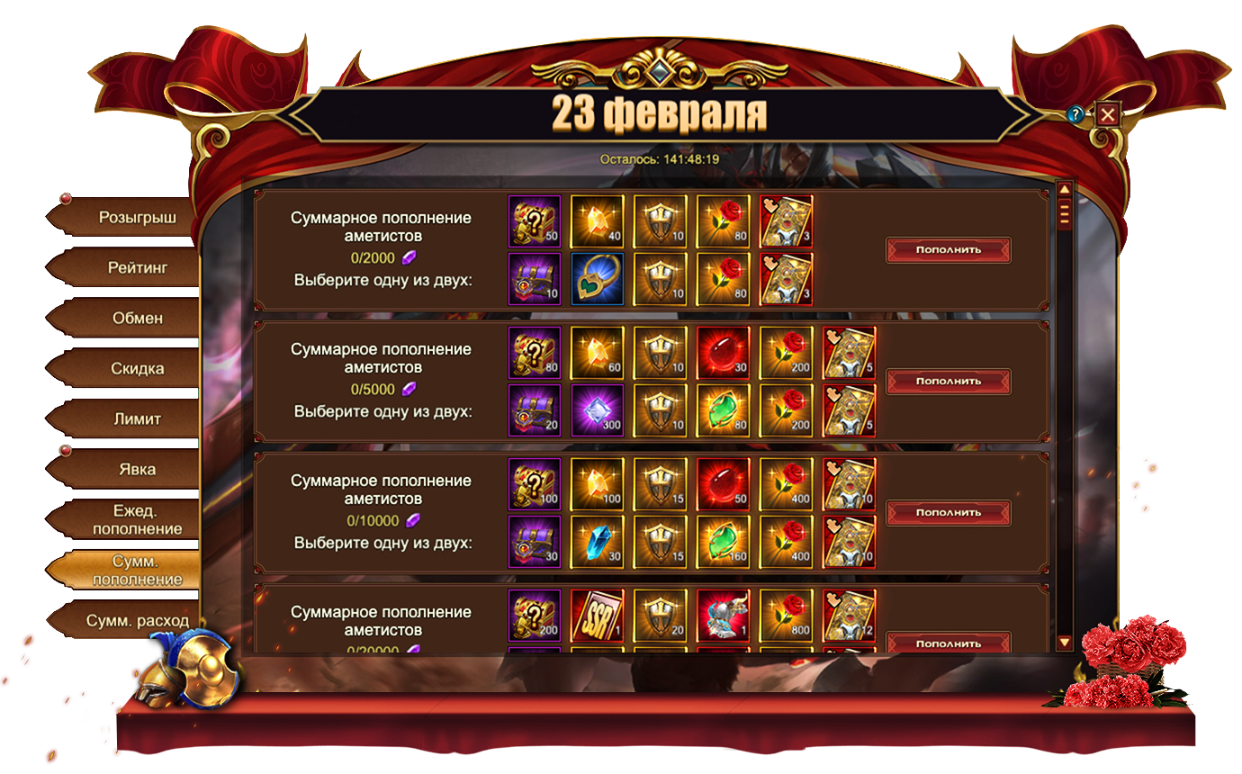 За пополнение счета на определенное количество аметистов за один день, вы можете получить: Сундук самоцветов 6 ур., Сундук магических ядер 3 ур., Сундук камней элементалей 4 ур., Сундук снаряжения скакуна (фиол.), Орден, Душа облика, Букет, Сундук кристаллов 7 ур., Оранжевое созвездие, Кодекс крыльев святости, [Эпич.] Стигмат, Сундук снаряжения героя (оранж.), Сущность артефакта, Песок темной звезды, Сундук редкостей, Фрагмент паровой стрекозы, Сундук с кодексом, Сундук редкостей.