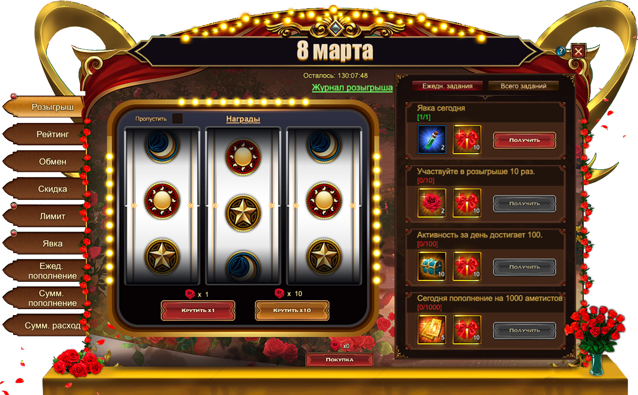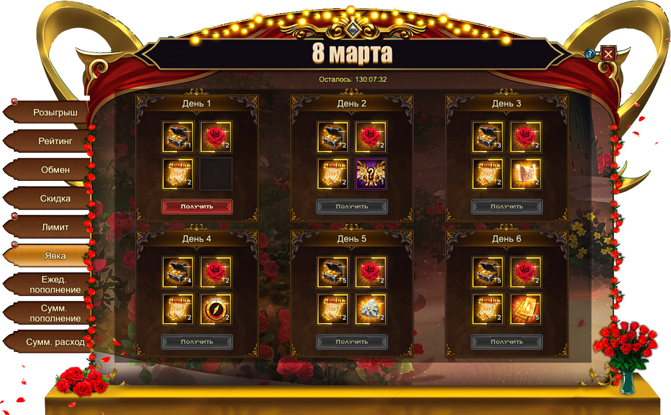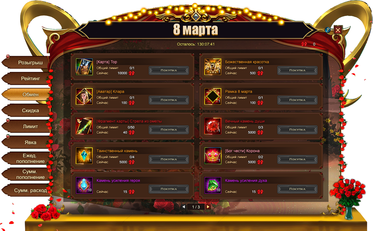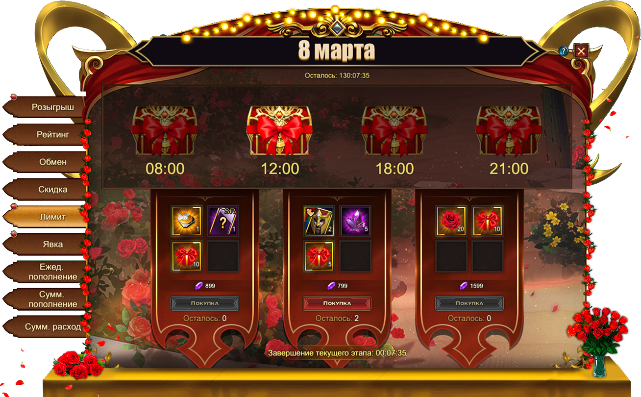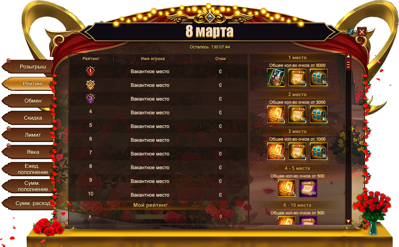Сегодня7 марта, в Eternal Fury Reborn запущены новые тематические события — 8 Марта, которые продлятся ровно шесть дней до 12 марта включительно. Наслаждайтесь жизнью, отдыхайте и набирайтесь сил для новых подвигов ради прекрасных дам!
