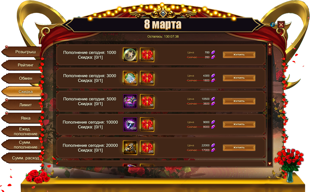 Обратите внимание, для активации скидки необходимо выполнить условие из первого столбца. Например, на скриншоте ниже, для приобретения со скидкой набора из Легендарного Эльфа и 10 Бантов необходимо пополнить счет на 1000.