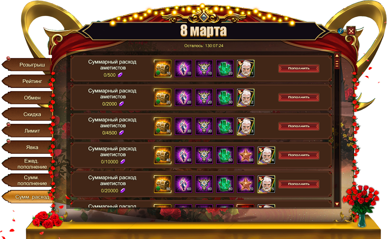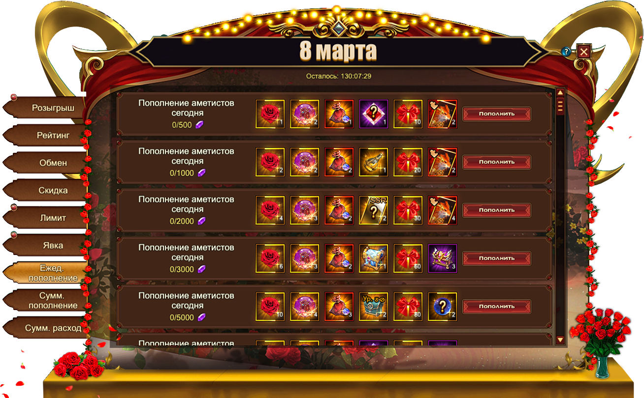 За пополнение счета на определенное количество аметистов за один день, вы можете получить: Сундук кристаллов 6 ур., Сундук камней элементаля 4 ур., [Героич.] Стигмат, Сундук снаряжения героя (фиолет.), Лунный камень души, Цветок богини, Бант, Душа облика, Зелье навыка, Сундук карт SSR, Сундук самоцветов 7 ур., Кодекс крыльев святости, Сундук снаряжения питомца (оранж.), Сущность артефакта, Сундук редкостей, Фрагмент лисицы, [Фрагмент карты] Тюр.
