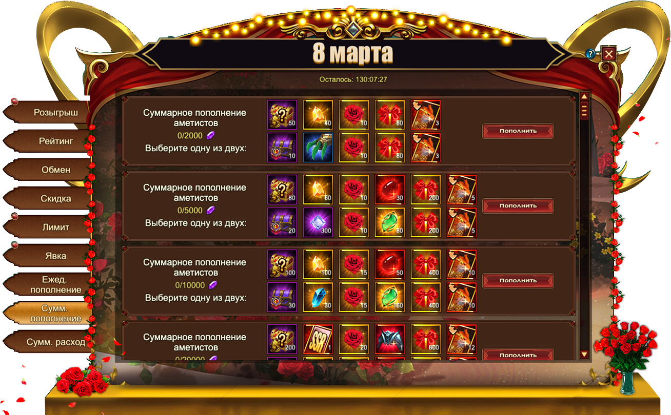 За пополнение счета на определенное количество аметистов за один день, вы можете получить: Сундук кристаллов 6 ур., Сундук камней элементаля 4 ур., [Героич.] Стигмат, Сундук снаряжения героя (фиолет.), Лунный камень души, Цветок богини, Бант, Душа облика, Зелье навыка, Сундук карт SSR, Сундук самоцветов 7 ур., Кодекс крыльев святости, Сундук снаряжения питомца (оранж.), Сущность артефакта, Сундук редкостей, Фрагмент лисицы, [Фрагмент карты] Тюр.