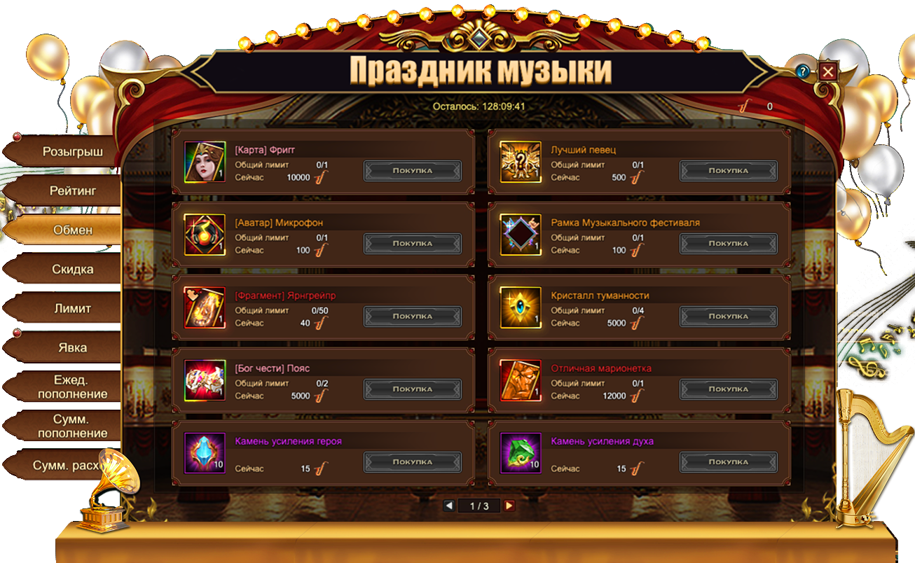 Здесь любопытные искатели приключений могут отыскать временные предложения, доступные в течение ограниченного времени и в ограниченном количестве. Группы товаров доступы с 8:00 до 11:59, с 12:00 до 17:59, с 18:00 до 20:59 и с 21:00 до 7:59. В этот раз вы можете получить в том числе: Саксофон, Монеты музыкальных автоматов, Обучающее устройство, Эссенция талисмана, Янтарь, [Фрагмент Карты] Тор.