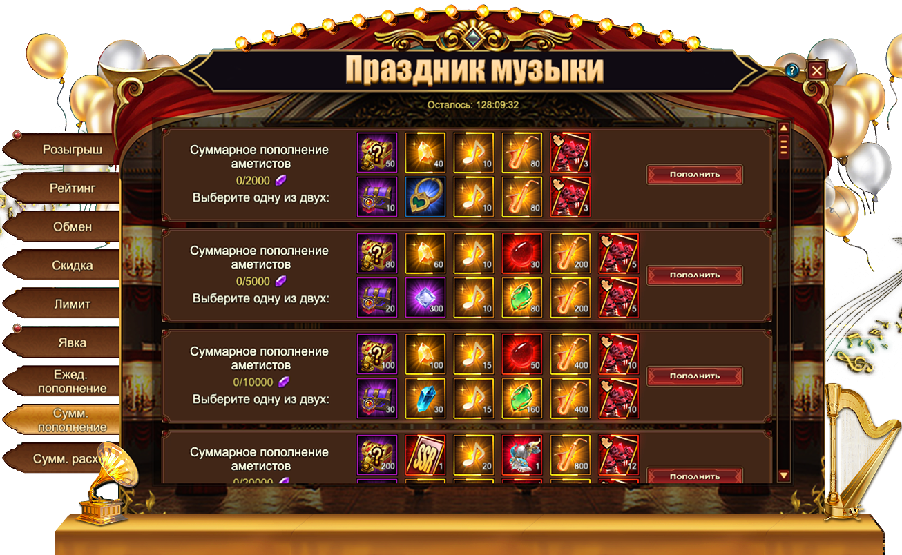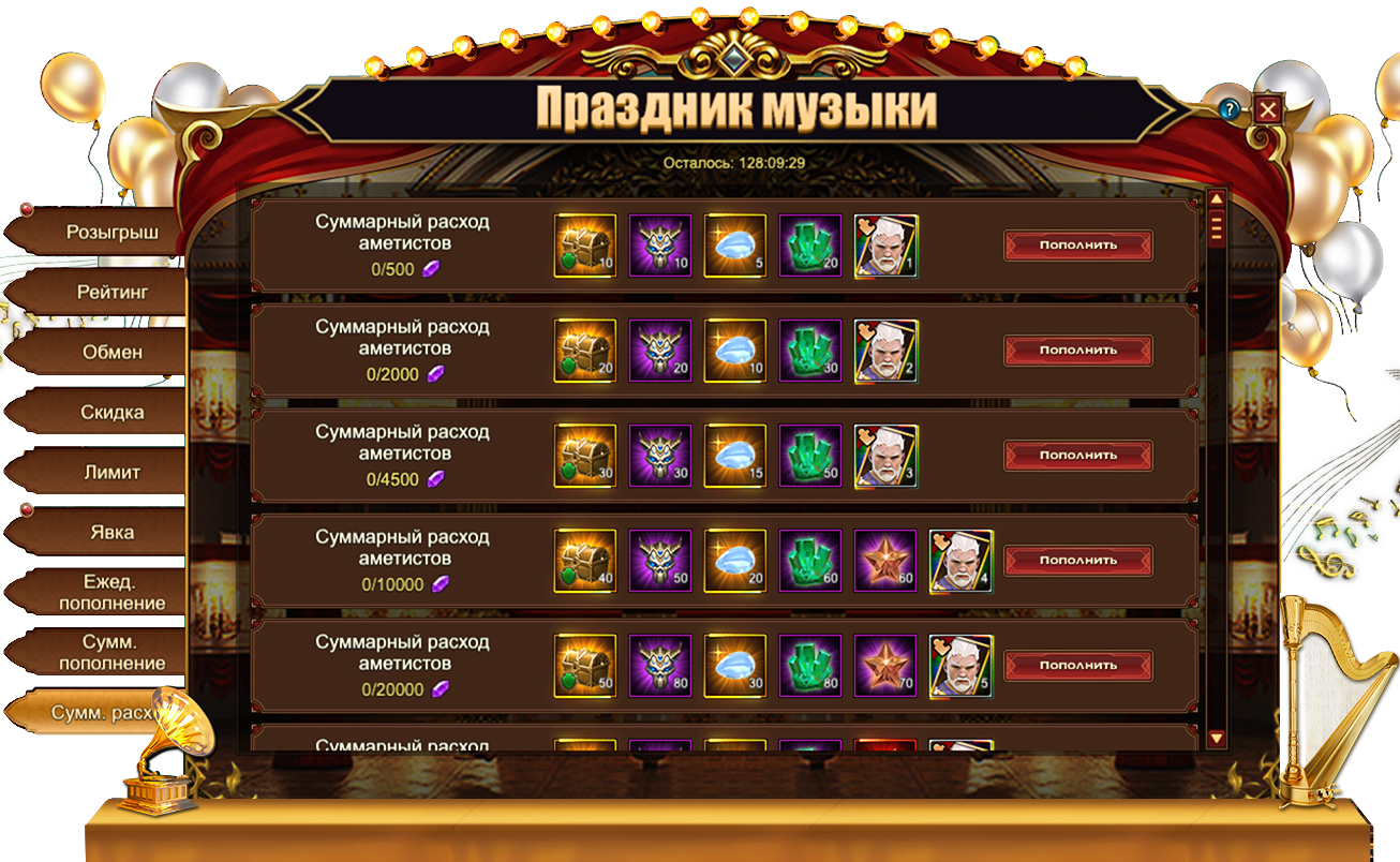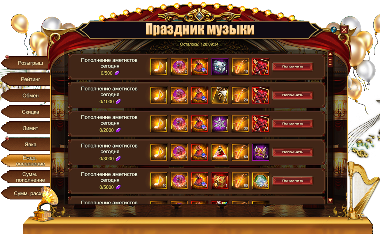 За пополнение счета на определенное количество аметистов за один день, вы можете получить: Сундук самоцветов 6 ур., Сундук камней элементаля 4 ур., Монеты музыкальных автоматов, Душа облика, Сундук карт SSR, Песок темной звезды, Сундук кристаллов 7 ур., Дух крыльев святости, Оранжевое созвездие, [Эпич.] Стигмат, Сундук снаряжения героя (оранж.), Сущность артефакта, Сундук редкостей, Фрагмент цербера, Сундук с кодексом, Сундук карт UR, [Фрагмент карты] Тюр.