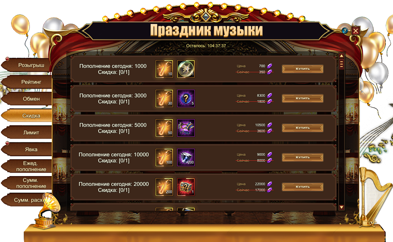 Обратите внимание, для активации скидки необходимо выполнить условие из первого столбца. Например, на скриншоте ниже, для приобретения со скидкой набора из Легендарного эльфа и 10 Саксофонов необходимо пополнить счет на 1000.