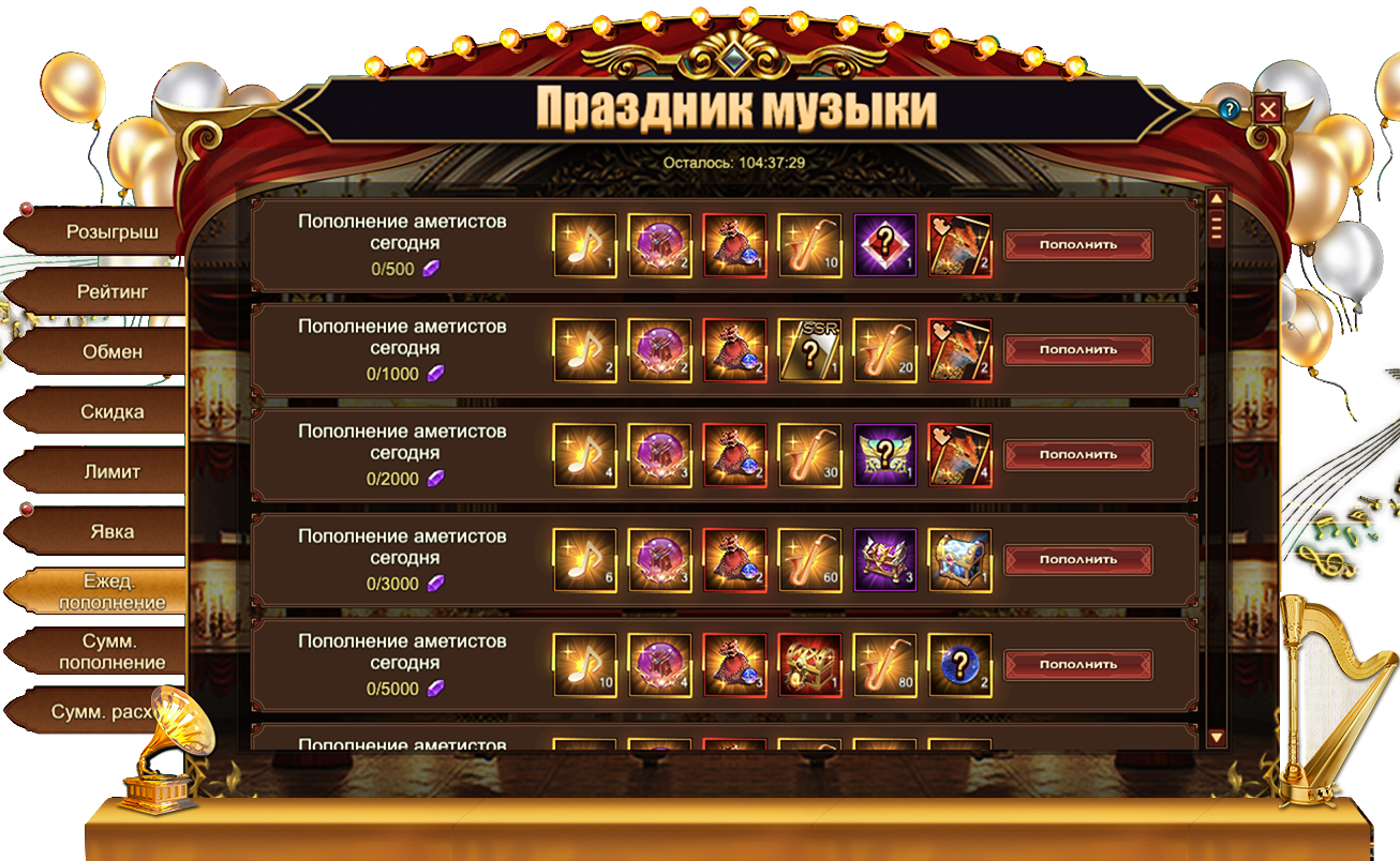 За пополнение счета на определенное количество аметистов за один день, вы можете получить: Сундук кристаллов 6 ур., Сундук камней элементаля 4 ур., Сундук магических ядер 3 ур., Ноты, Саксофон, Душа облика, Песок темной звезды, Сундук карт SSR, Сундук самоцветов 7 ур., Оранжевое созвездие, [Эпич.] Стигмат, Сундук снаряжения героя (оранж.), Сундук книг навыков, Сундук снаряжения скакуна (оранж.), Сущность артефактаСундук редкостей, Фрагмент лисицы, Сундук с кодексом, [Фрагмент карты] Тюр.