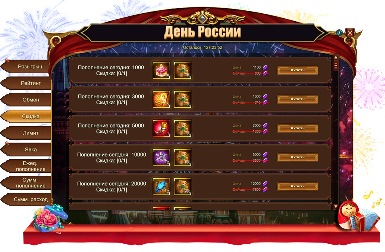 Обратите внимание, для активации скидки необходимо выполнить условие из первого столбца. Например, на скриншоте ниже для приобретения со скидкой набора из 10 День России торт и 10 Медвежат необходимо пополнить счет на 1000.