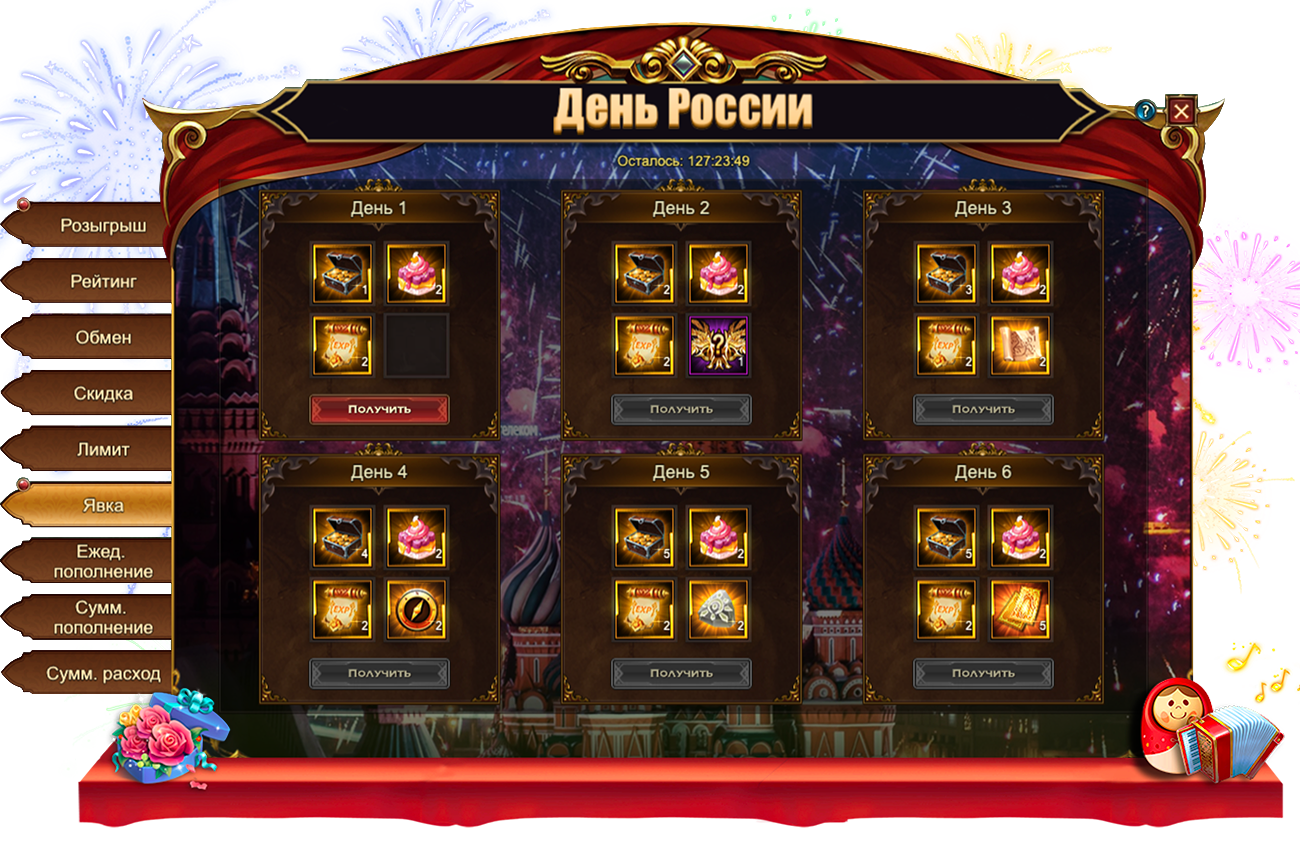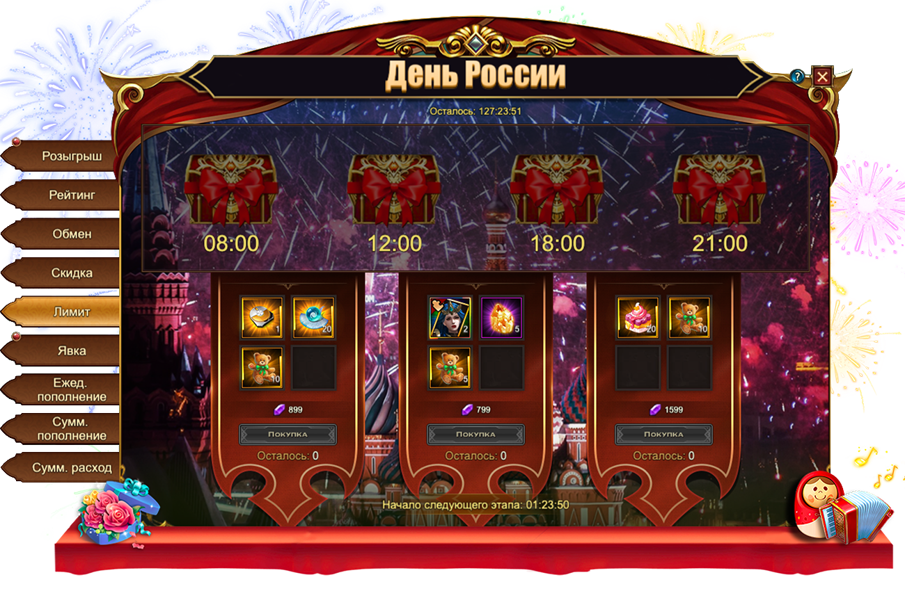 наборов наград со следующими предметами: Селенит, РутилСундук души 1, Сундук пробуждения богиниЦитрин, Эссенция пробуждения, Медвежонок, День России торт, Сундк карт SSRФрагмент Мамонта, Кристалл души крыльев, Камень мудрости, Карта героя класса SSR, [Валькирия] Броня, [Валькирия] Венец, [Валькирия] Меч, Скидбладнир, Молот разбойника, Наряд разбойника, Сундук карт UR, Красное созвездие, Сундук снаряжения скакуна (красн.), Сундук питомцев, Сундук сокровищ богини[Карта] Брунгильда[Карта] Тюр