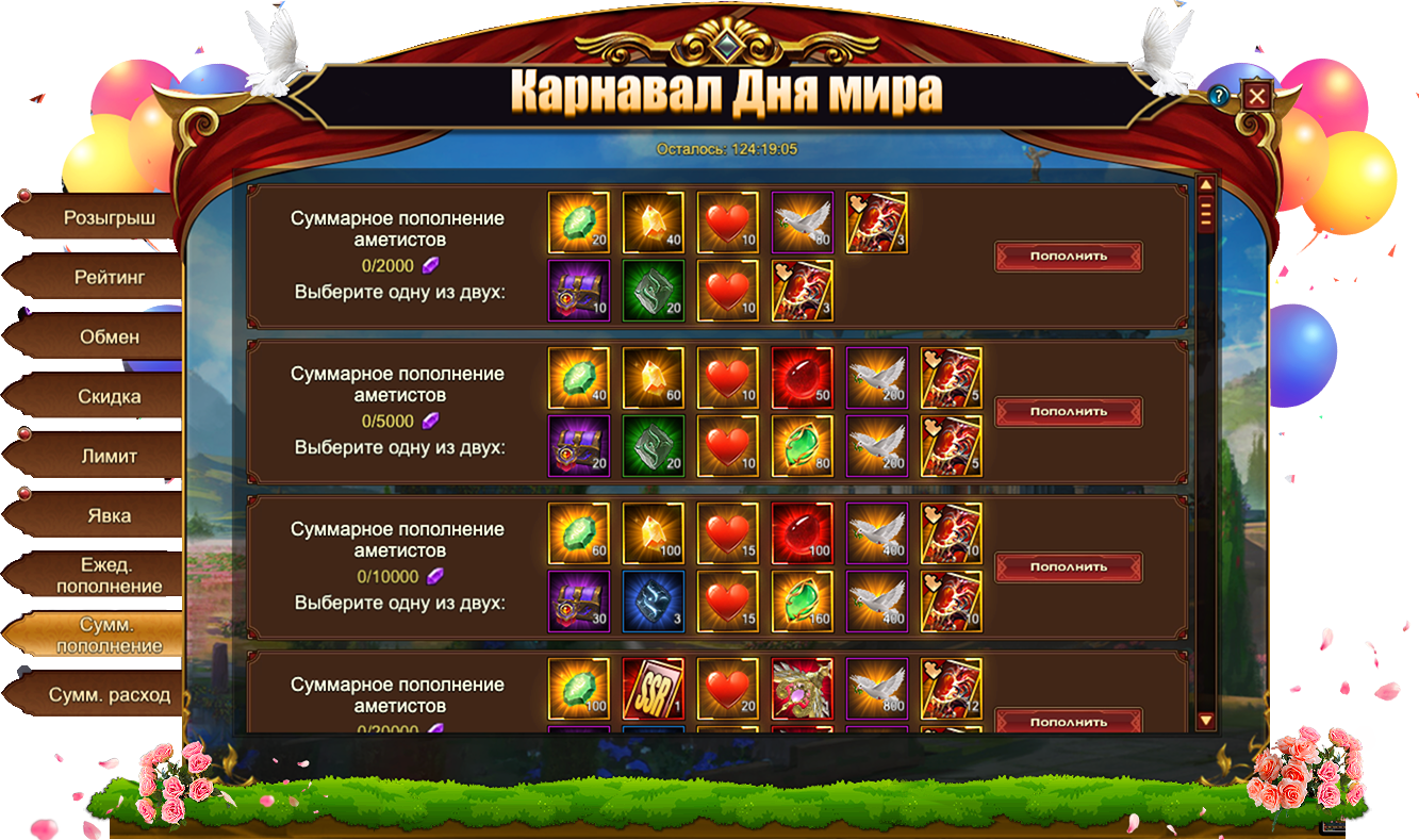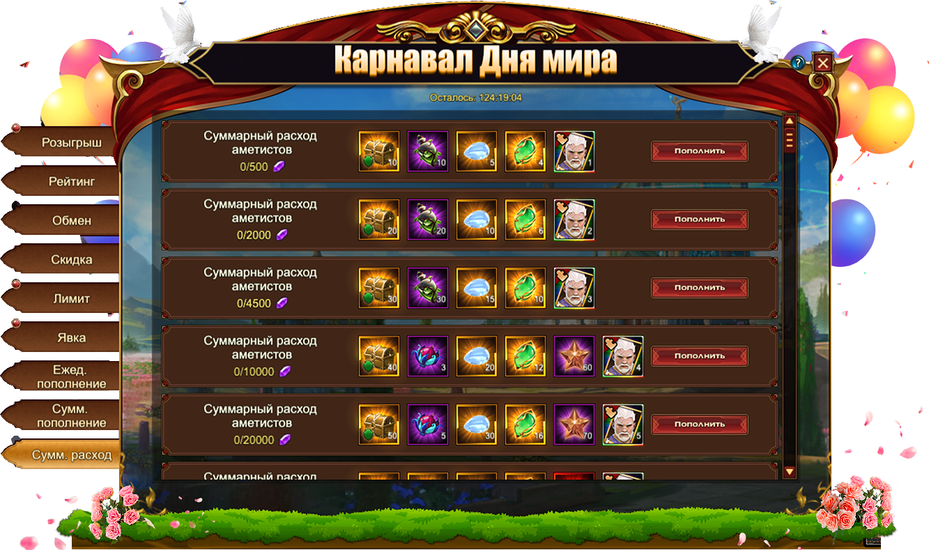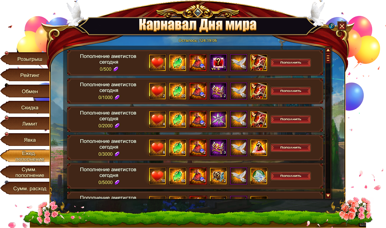 За пополнение счета на определенное количество аметистов за один день, вы можете получить: Сундук кристаллов 5 ур., Сундук камней элементаля 4 ур., Голубь МираЖетон Дня мира, Дух крыльев святости, Цитрин, Фрагмент крыльев-клинков, Сундук кристаллов 7 ур., Сундук книг навыков, Сундук снаряжения питомца (оранж.), Сундук снаряжения героя (оранж.), Сущность артефакта, Турмалин, Оранжевое созвездиеСундук редкостей[Фрагмент карты] Тюр.