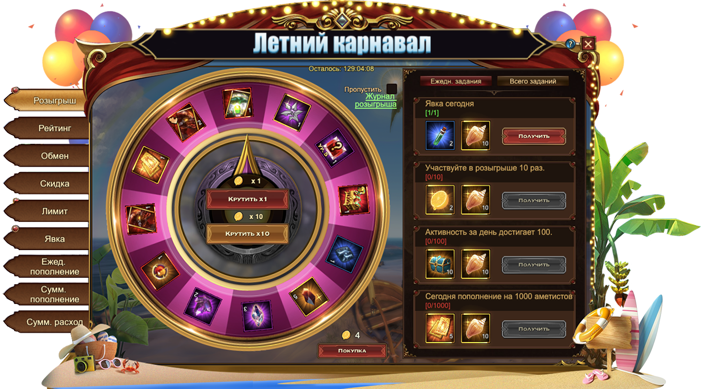 Участвуйте в розыгрыше различных ценных предметов, чтобы получить: Рутил, Мрачные одежды, Чароит, Сундук кристаллов 5 ур., Кристалл чар демона, Песок темной звезды, Свиток славы, Кристалл души крыльев, Фрагмент дракона, Сундук наряда бога обмана, Мегингъёрд и даже Дракон целиком!