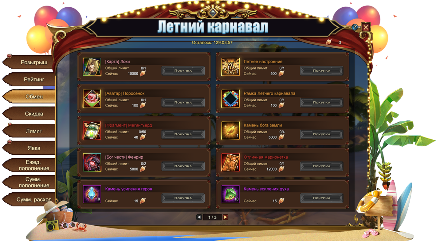 Морские раковины, собранные во время данного Фестиваля, позволяют приобрести множество интересных предметов, в том числе и эксклюзивных для данного события: [Карта] Локи, Особый титул Летнее настроение, [Аватар] Поросенок, Рамка Летнего карнавала, [Фрагмент] Мегингъёрд. Если эксклюзивные предметы вас не интересуют, всегда можно обменять Морские раковины на полезные ресурсы. Например, на Камень бога земли, Отличная марионетка или [Бог чести] Фенрир.