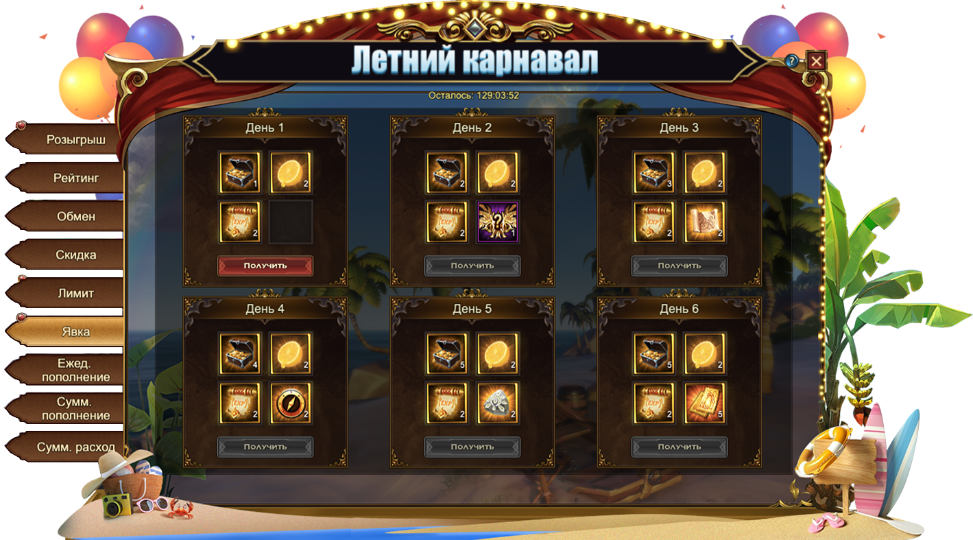 За посещение события ежедневно становятся доступны различные подарки. Например: Апельсин, Сумка золота, Оранжевый свиток опыта, Титул Летний рай, Потерянная карта, Пропуск на Арену, Компас, Свиток славы.