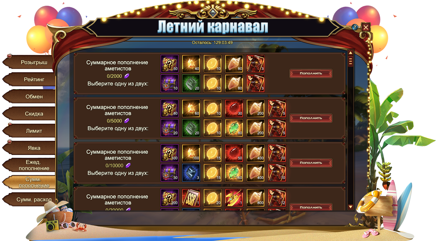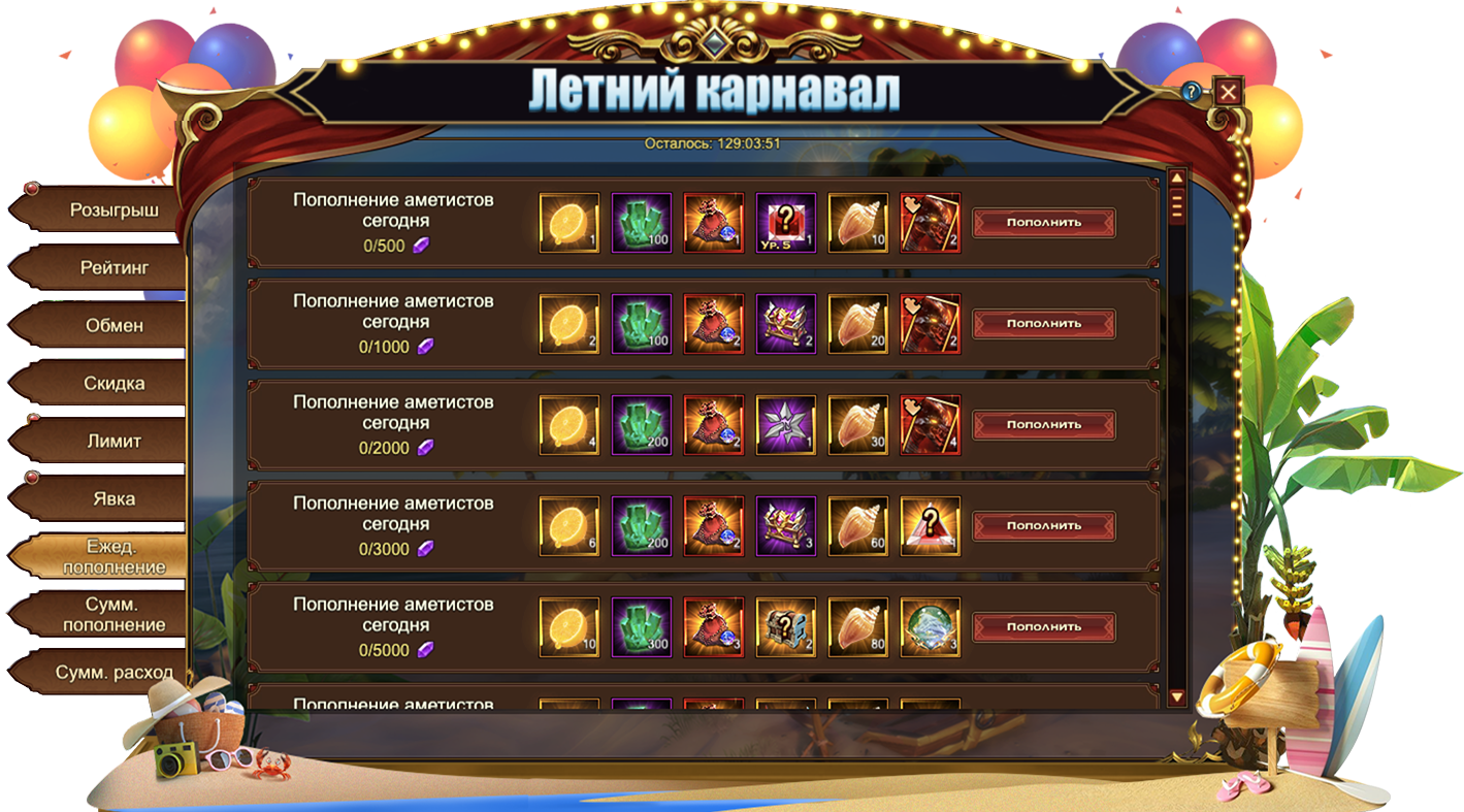 За пополнение счета на определенное количество аметистов за один день, вы можете получить: Сундук кристаллов 5 ур., Сундук камней элементаля 4 ур., Изумруд, Апельсин, Морская раковина, Дух крыльев святости, Сундук кристаллов 7 ур., Сундук книг навыков, Сундук снаряжения питомца (оранж.), Сундук снаряжения героя (оранж.), Сущность артефакта, Турмалин, Сундук редкостей, Фрагмент дракона, [Фрагмент карты] Тюр.