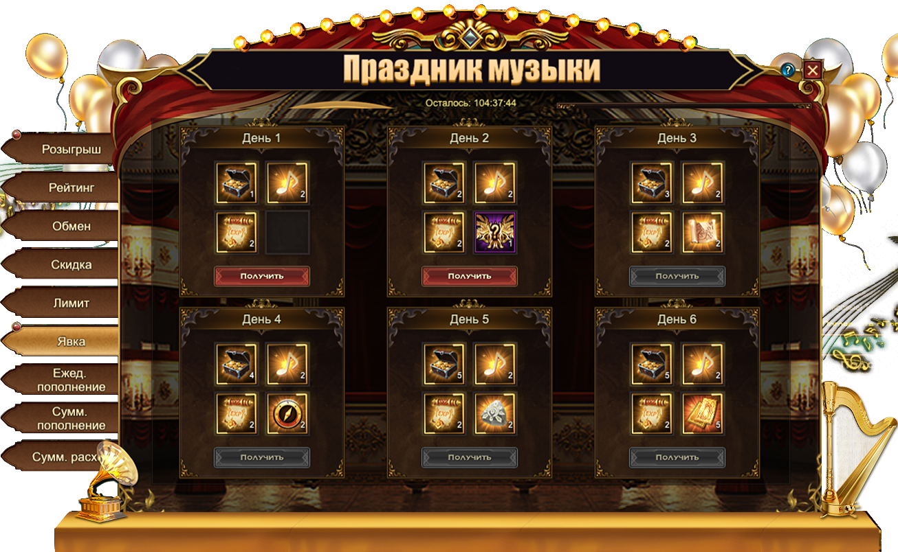 За посещение события ежедневно становятся доступны различные подарки. Например: Ноты, Сумка золота, Оранжевый свиток опыта, уникальный титул Выдающийся певец, Потерянная карта, Пропуск на Арену и Свиток славы.