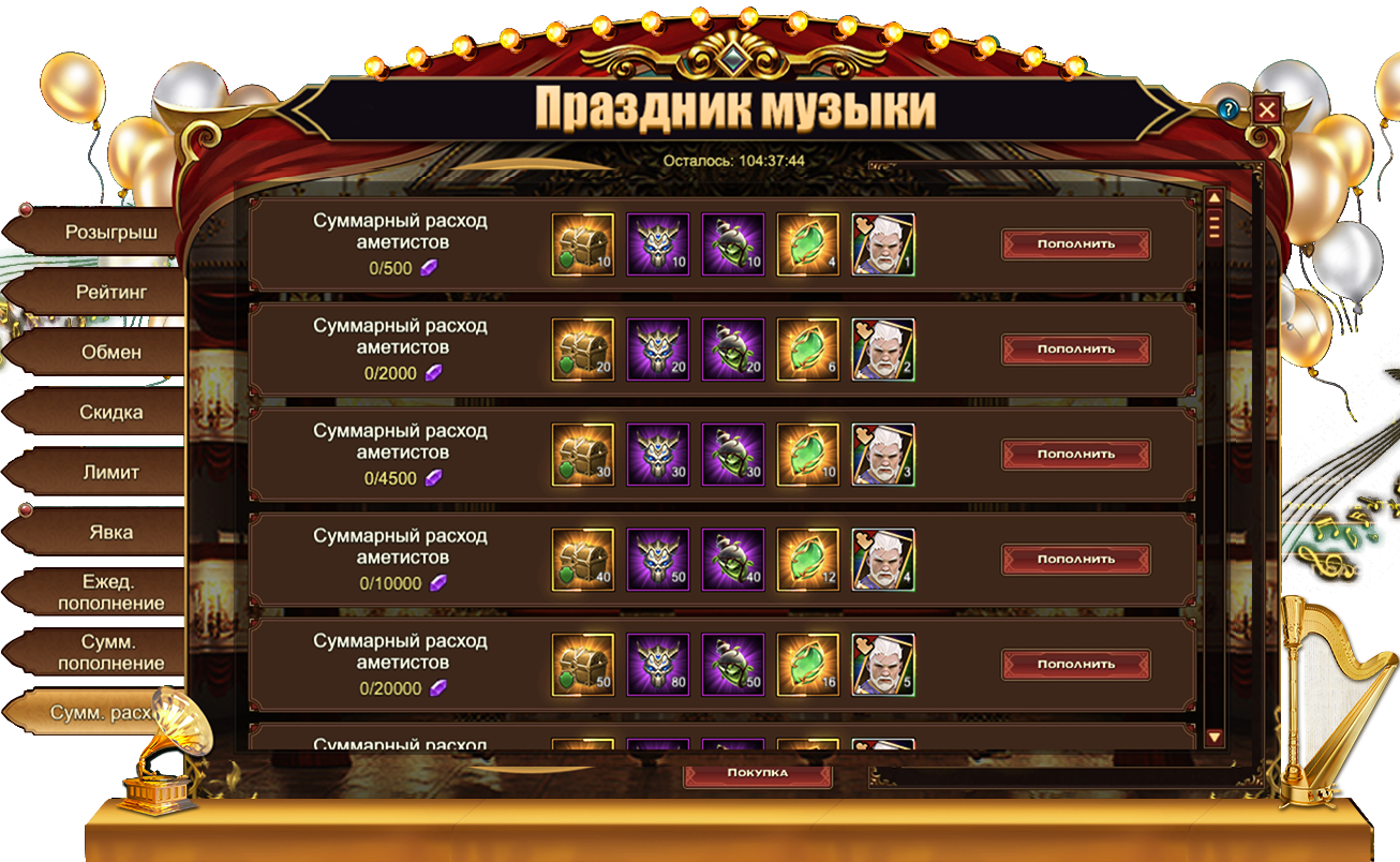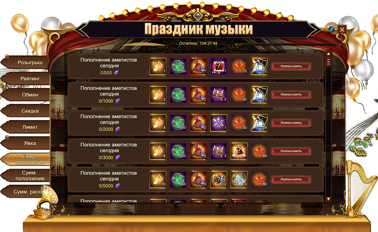 За пополнение счета на определенное количество аметистов за один день, вы можете получить: Изумруд, Сундук кристаллов 5 ур., Сундук камней элементаля 4 ур., Нота, Саксофон, Душа крыльев святости, Песок темной звезды, Сундук кристаллов 7 ур., Сундук снаряжения питомца (оранж.), Сундук снаряжения героя (оранж.), Сундук книг навыков, Турмалин, Фрагмент сибы-ину, Сущность артефакта, Сундук редкостей, Сундук самоцветов 8 ур., [Фрагмент карты] Тюр.