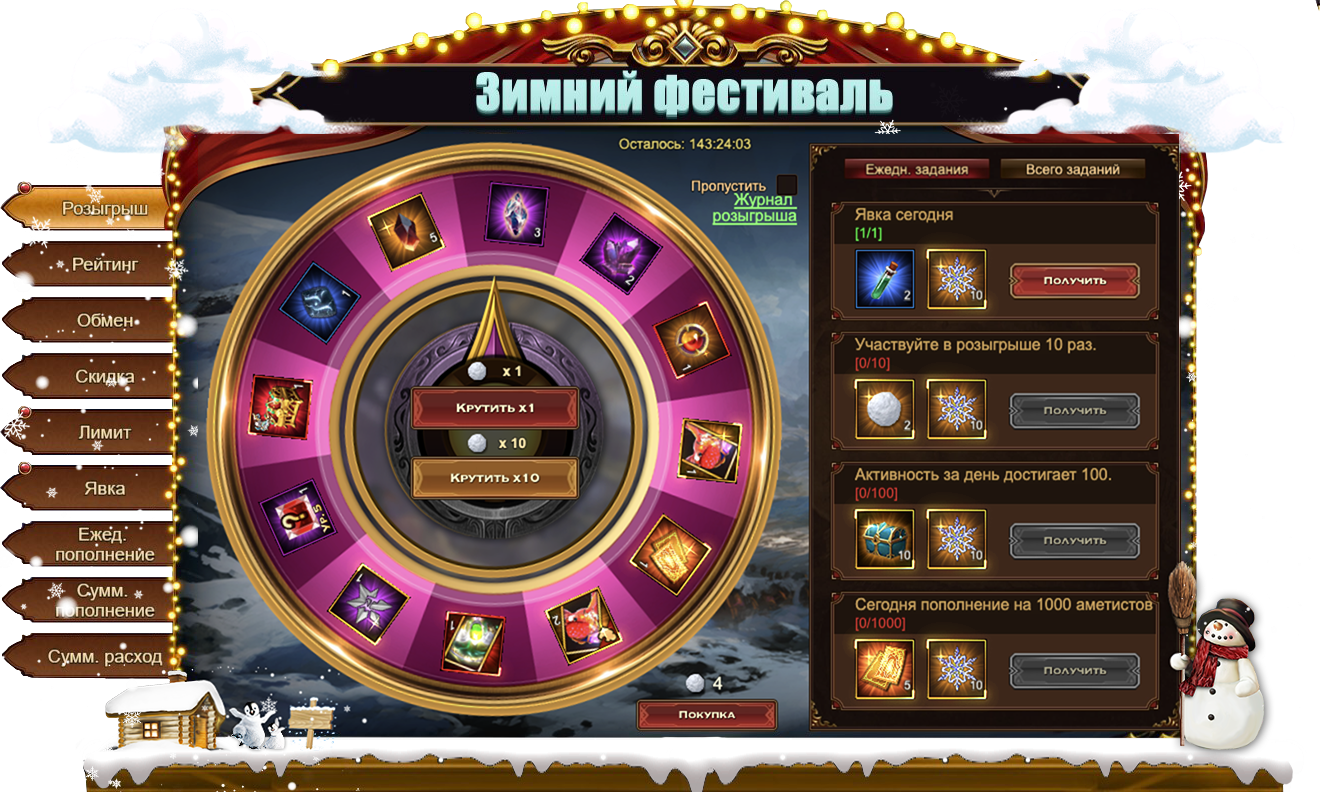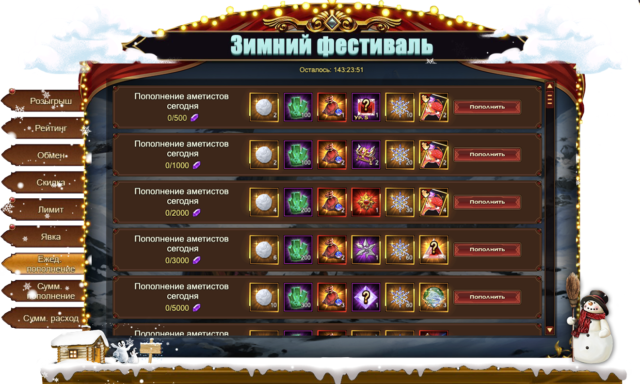 За пополнение счета на определенное количество аметистов за один день, вы можете получить: Изумруд, Сундук кристаллов 5 ур., Сундук камней элементаля 4 ур., [Героич.] Стигмат, Снежок, Снежинка, Сундук кристаллов 7 ур., Дух крыльев святости, Фрагмент золотой рыбки, Песок темной звезды, Сундук снаряжения питомца (оранж.), Сундук снаряжения героя (оранж.), Знак разрушения, Сущность артефакта, Сундук редкостей, Письмо с молитвой, Сундук самоцветов 8 ур., [Фрагмент карты] Тюр.