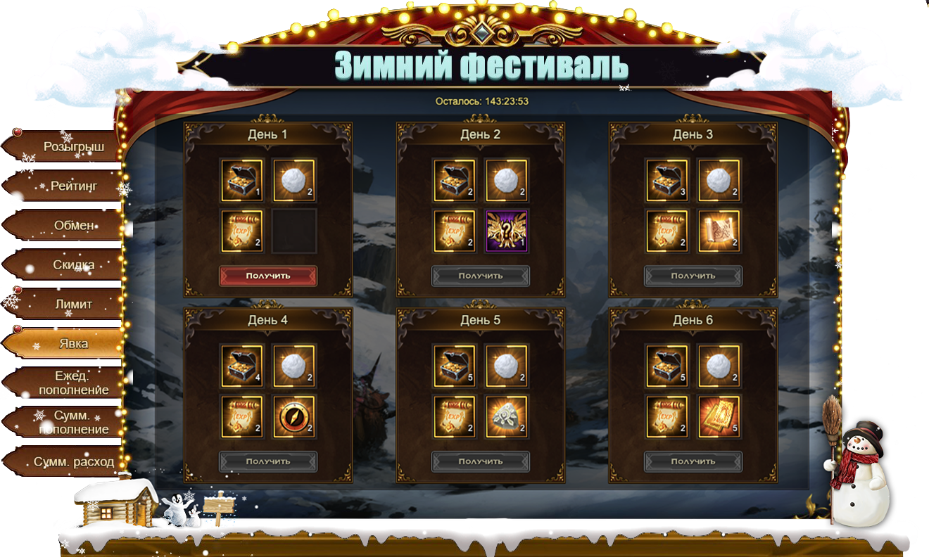 За посещение события ежедневно становятся доступны различные подарки. Например: Снежок, Сумка золота, Оранжевый свиток опыта, уникальный титул Снеговик, Потерянная карта, Пропуск на Арену, Компас и Особый свиток призыва.