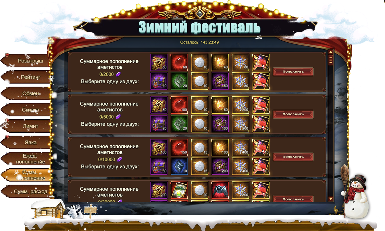 Обратите внимание, для активации скидки необходимо выполнить условие из первого столбца. Например, на скриншоте ниже, для приобретения со скидкой набора из 10 Снежинок и 10 Снежков необходимо пополнить счет на 1000.