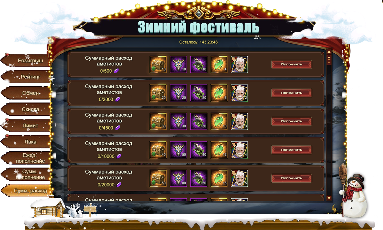 Снежинки, собранные во время данного Фестиваля, позволяют приобрести множество интересных предметов, в том числе и эксклюзивных для данного события: [Карта] Тор, титул Зимний командир[Аватар] СнегурочкаРамка Зимнего фестиваля[Фрагмент] Мегингъёрд. Если эксклюзивные предметы вас не интересуют, всегда можно обменять Снежинки на полезные ресурсы. Например, на Камень бога земли, [Бог чести] Фенрир или Отличная марионетка