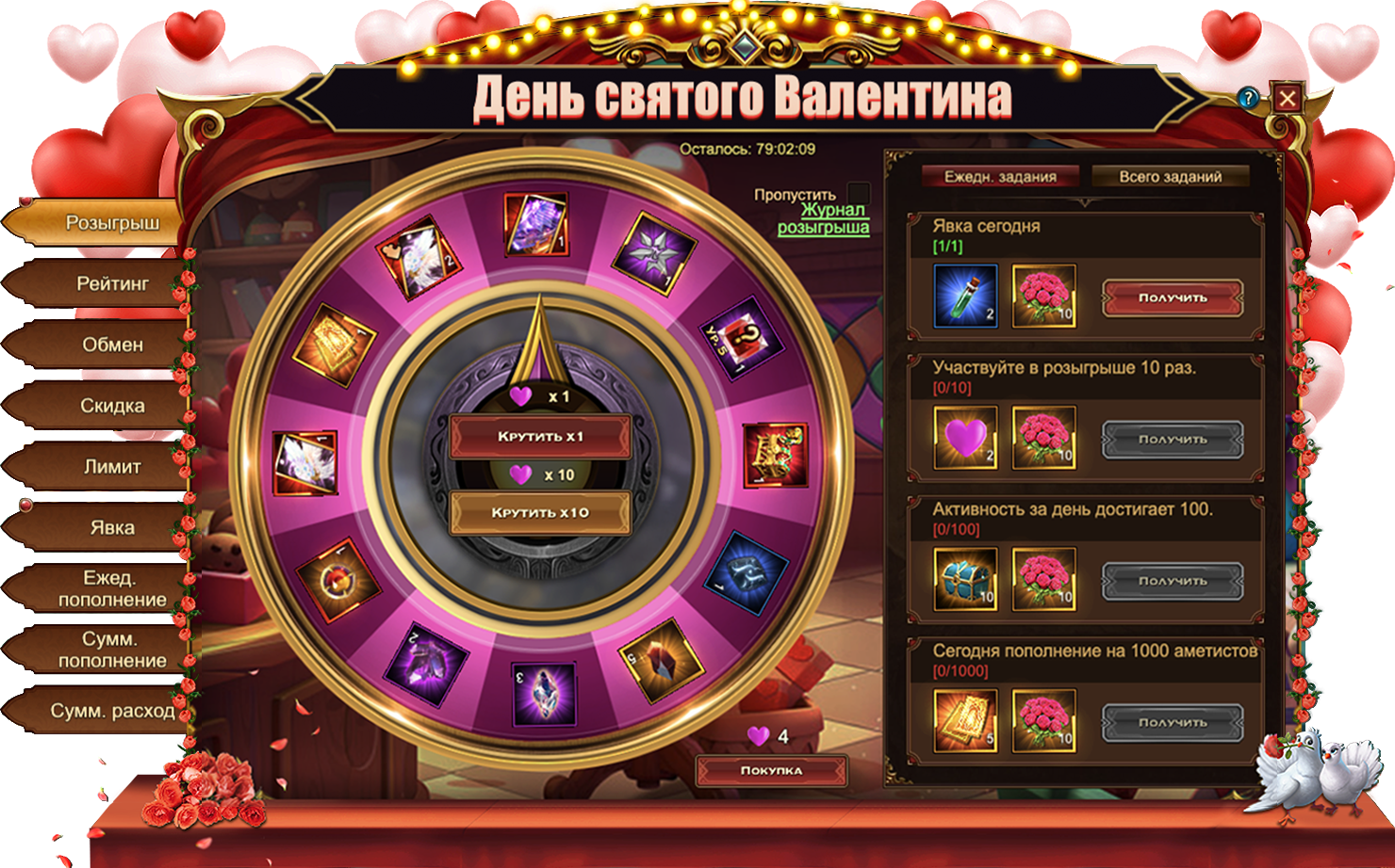 Участвуйте в розыгрыше различных ценных предметов, чтобы получить: Рутил, Сундук кристаллов 5 ур., Мрачные одежды, Чароит, Песок темной звезды, Свиток славы, Кристалл чар демона, Кристалл души крыльев, Скидбладнир, Сундук наряда бога обмана, Фрагмент крыльев купидона и даже Крылья купидона целиком!