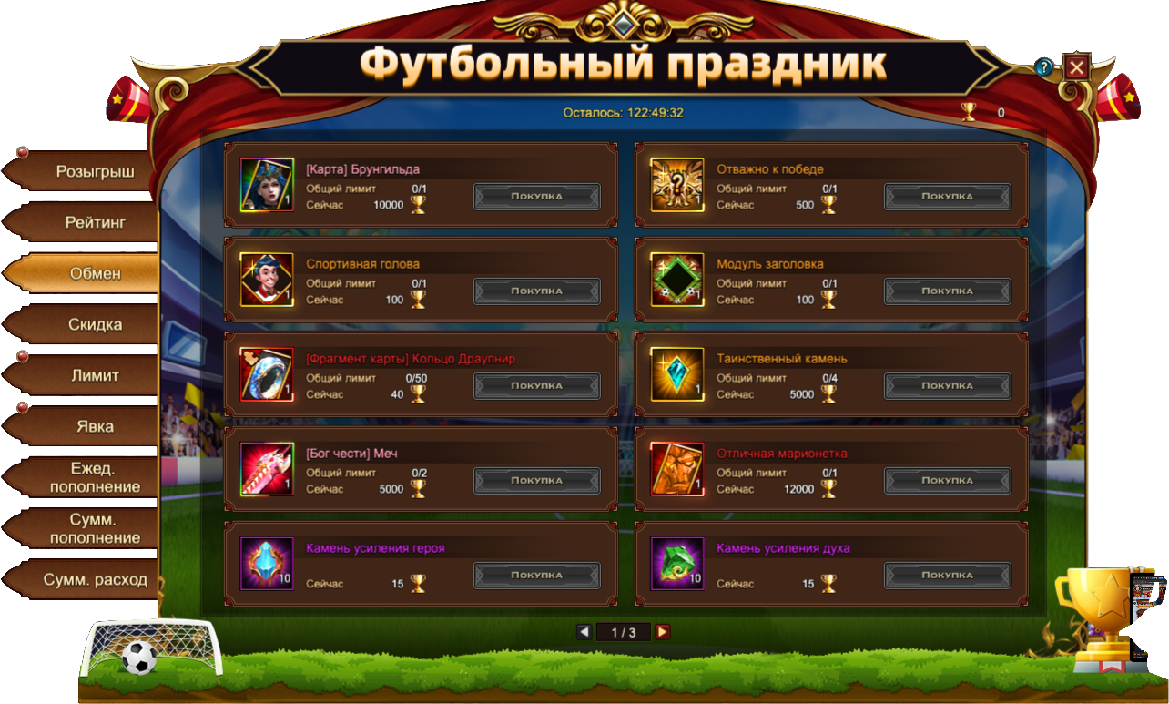 Трофеи, собранные во время данного Фестиваля, позволяют приобрести множество интересных предметов, в том числе и эксклюзивных для данного события: [Карта] Брунгильда, Особый титул Отважно к победе[Аватар] Спортивная головаРамка праздника футбола[Фрагмент карты] Кольцо Драупнир. Если эксклюзивные предметы вас не интересуют, всегда можно обменять Трофеи на полезные ресурсы. Например, на Таинственный каменьОтличная марионетка или [Бог чести] Меч