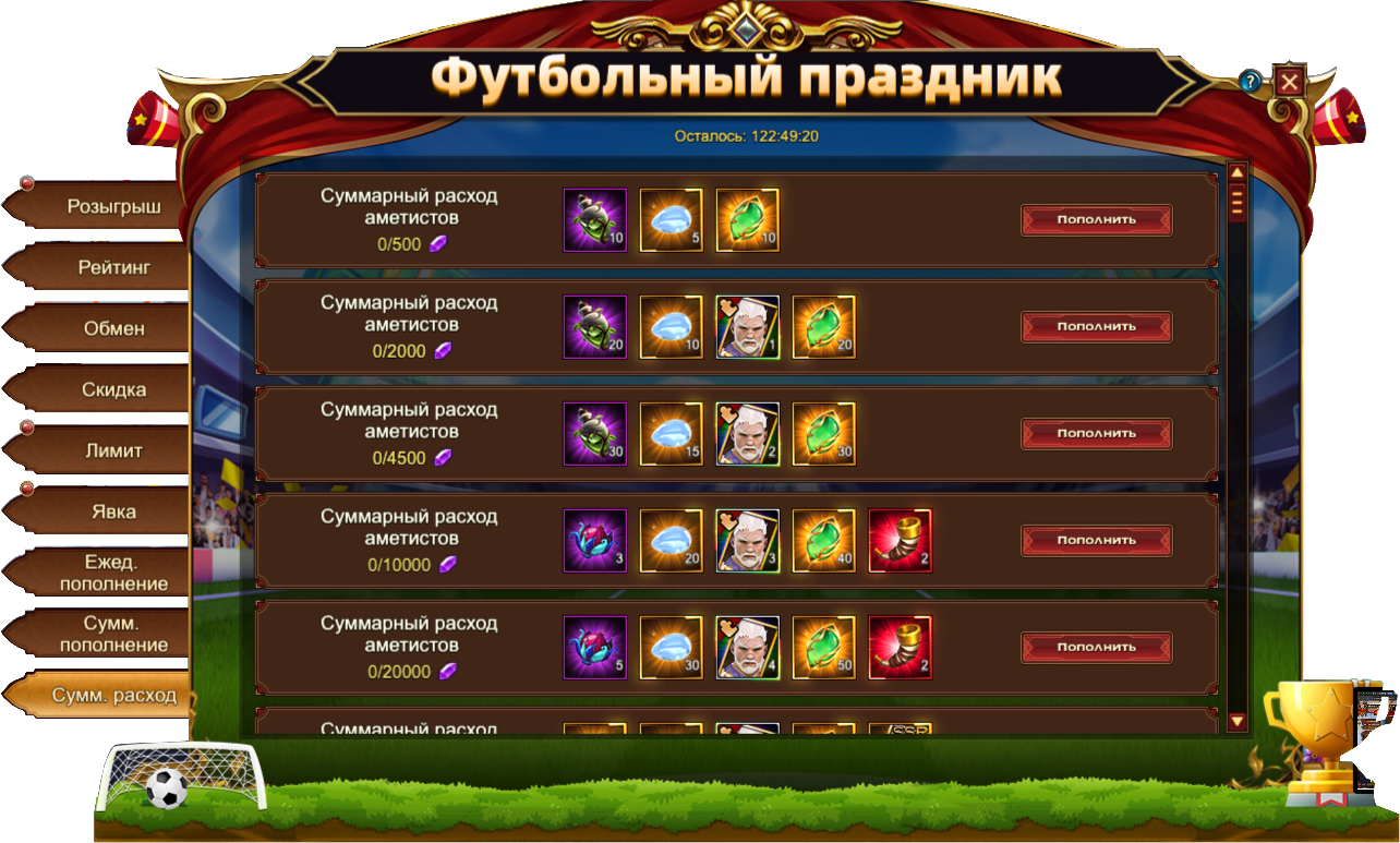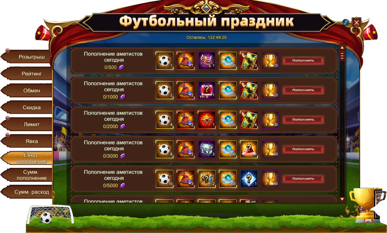 За пополнение счета на определенное количество аметистов за один день, вы можете получить: [Редк.] Стигмат, [Героич.] СтигматСундук кристаллов 5 ур.Сундук камней элементаля 4 ур., Сундук самоцветов 6 ур., Футбольный мячТрофейЭссенция талисмана, Сундук кристаллов 7 ур.Сундук кристаллов 9 ур., Сундук с эссенцией стигматаСундук книг навыков, Сущность артефактаСундук редкостей, Сундук карт UR, Письмо с молитвой, [Фрагмент карты] Тюр.