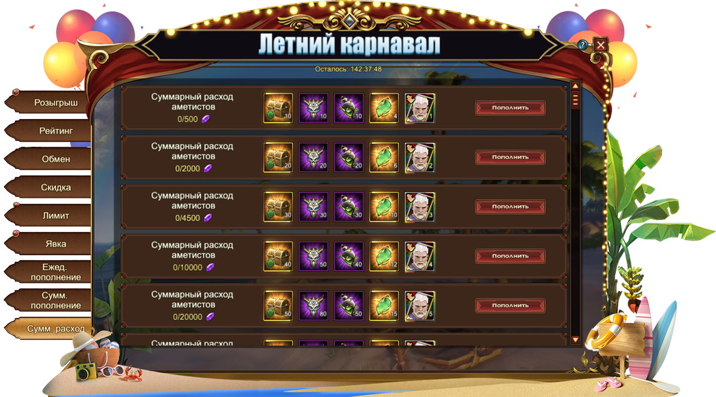 За пополнение счета на определенное количество аметистов за один день, вы можете получить: [Редк.] Стигмат, Сундук кристаллов 5 ур., Сундук камней элементаля 4 ур., Сундук самоцветов 6 ур., Изумруд, Апельсин, Морская раковина, Дух крыльев святости, Сундук кристаллов 7 ур., Сундук кристаллов 9 ур., Сундук с эссенцией стигмата, Сущность артефактаПисьмо с молитвой, Сундук редкостей, Сундук с кодексом, Простой горн, [Фрагмент карты] Тюр.