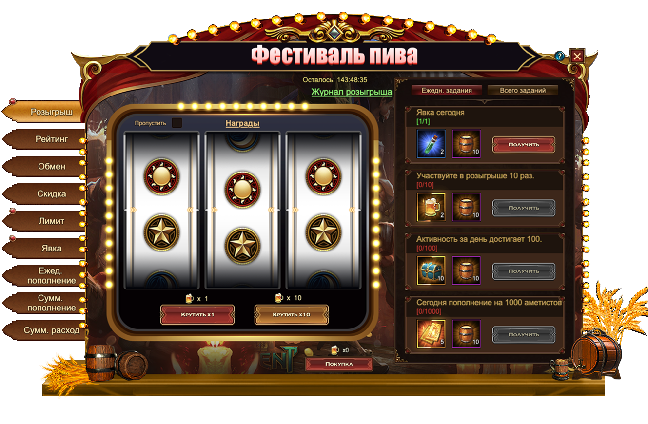 За пополнение счета на определенное количество аметистов за один день, вы можете получить: [Редк.] Стигмат, Сундук самоцветов 6 ур., Сундук кристаллов 5 ур., Сундук камней элементаля 4 ур., Камень усиления духа, [Героич.] Стигмат, Бочонок пива, Пиво, Цитрин, Сундук кристаллов 7 ур, Сундук кристаллов 9 ур., Сундук книг навыков, Сундук с эссенцией стигмата, Сущность артефакта, Сундук редкостей, Фрагмент меча бесконечности, Письмо с молитвой, Сундук карт UR, [Фрагмент карты] Тюр.