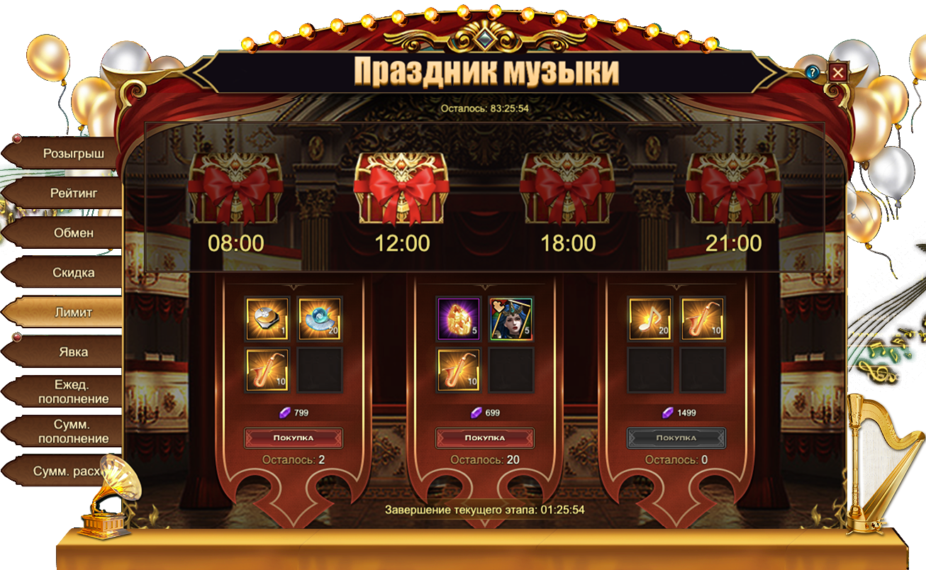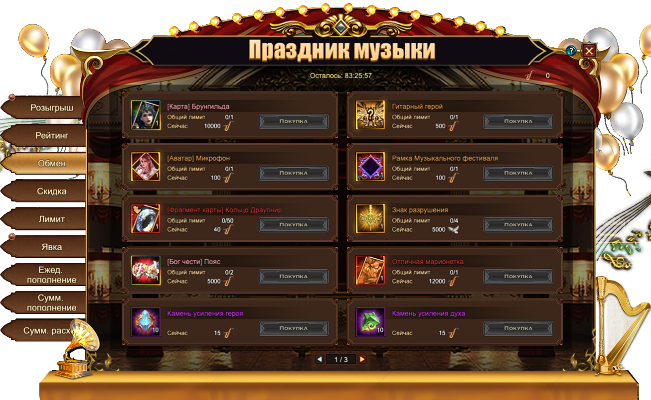 Здесь любопытные искатели приключений могут отыскать временные предложения, доступные в течение ограниченного времени и в ограниченном количестве. Группы товаров доступы с 8:00 до 11:59, с 12:00 до 17:59, с 18:00 до 20:59 и с 21:00 до 7:59. В этот раз вы можете получить в том числе: ЯнтарьЭссенция талисманаСаксофонНотыОбучающее устройство[Фрагмент Карты] Брунгильда.